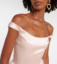 Magda Butrym aims to empower with sharp modern style, expertly delivered through artisanal excellence. This minidress is made from pure silk satin and features an off-shoulder silhouette and exaggerated, sculptural hip pads. Product Details - Material: 100% silk - Care instructions: dry clean - Made in Poland - Designer color name: Pink - Item color: pink - Lining: 100% silk - Closure: invisible zipper - Item number: P01083673 Size & Fit - True to size - Off-the-shoulder - Cinched waist - Non-stretchy fabric - The model seen in the picture is 178cm-5'10" and wearing a size FR 36