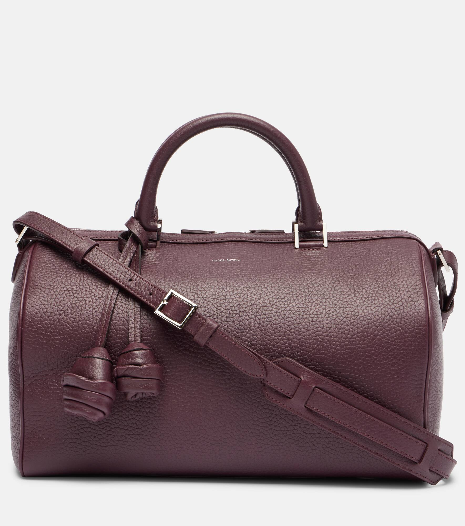 The Varsovia duffel bag from Magda Butrym has a structured silhouette cut from grained leather. The two top handles and a detachable shoulder strap allow for versatile holding. Product Details - Material: leather - Lining: leather - Made in Italy - Designer color name: Purple - Item color: burgundy - Includes: dust bag - Detachable shoulder strap, Top handles - Hardware color: silver - Internal details: single compartment, internal slot pocket - Item number: P01074892 Size & Fit - Height 21cm-8.5" - Width 36,5cm-14.5" - Depth 19,5cm-7.5" - Length of handle 34cm-13.5" - Min. length shoulder strap 87cm-34.5" - Max. length shoulder strap 107cm-42"