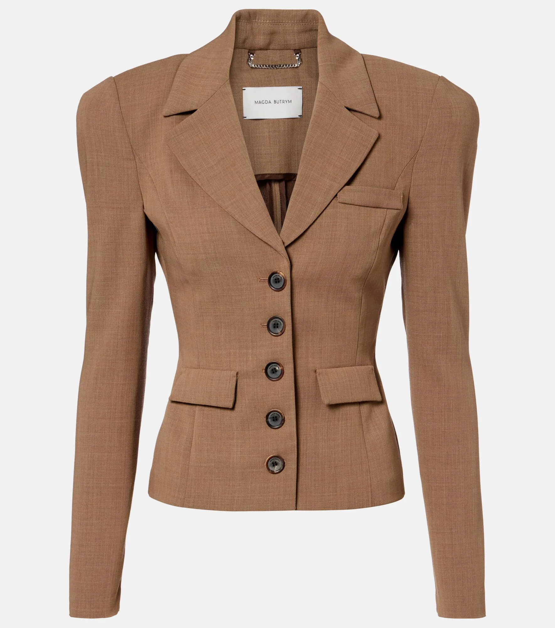 Magda Butrym aims to empower with sharp modern style, expertly delivered through artisanal excellence. This blazer is made from soft wool and finished with a cinched waist and padded shoulders. Product Details - Material: 99% wool, 1% polyamide - Care instructions: dry clean - Made in Poland - Color: brown - Designer color name: Beige - Shoulder pads - Closure: buttoned front - Unlined - Item number: P01130860 Size & Fit - True to size - Shoulder pad inserts - Cinched waist - Non-stretchy fabric - Falls to the hip - The model seen in the picture is 178cm-5'10" and wearing a size FR 36