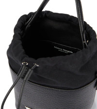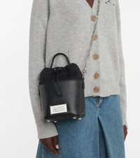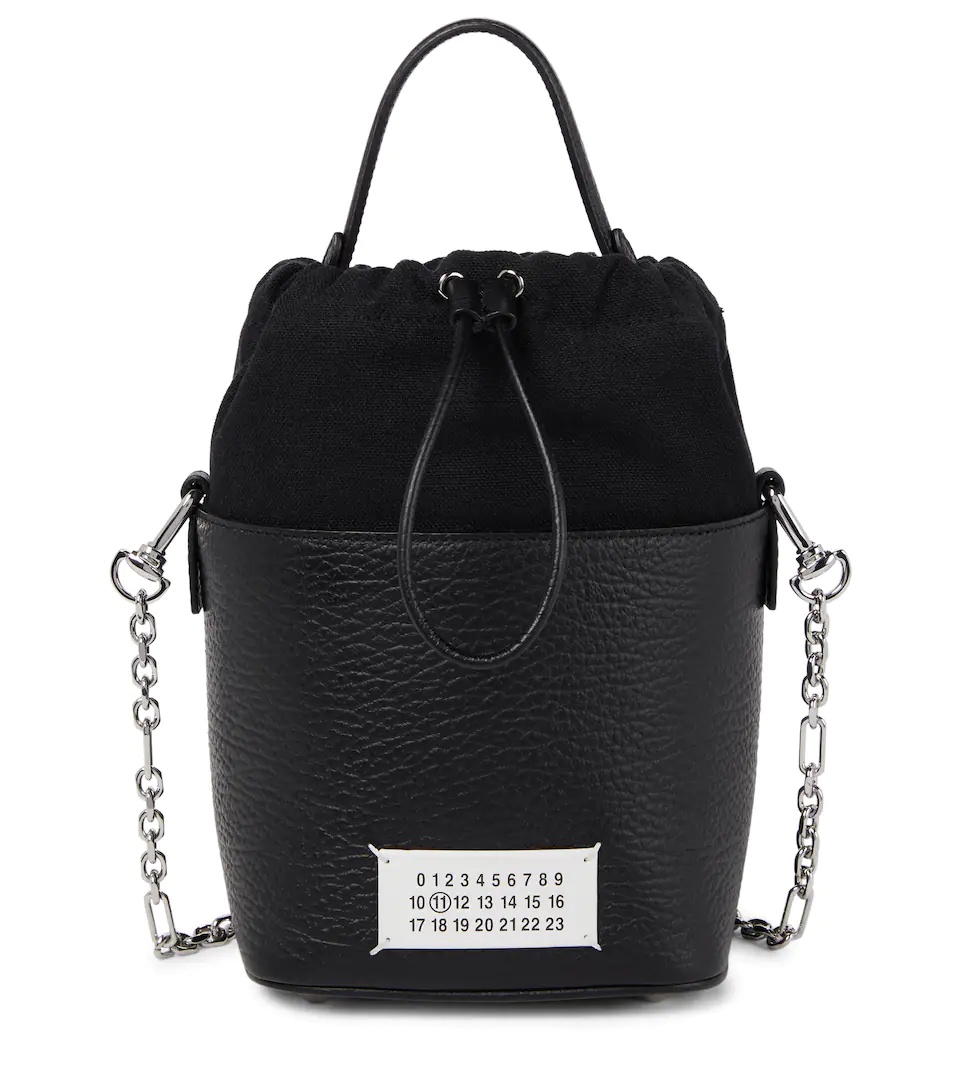Made in Italy from grained black leather and canvas, this bucket shoulder bag from Maison Margiela has a detachable leather top handle, a silver-tone chain shoulder strap and metal feet. The versatile design is detailed with the label's numeric label at the front. Product Details - Internal details: fabric lining - Made in Italy - Designer color name: Black - Comes with dust bag - Detachable top handle - Color of fastening: silver - Closure: drawstring top - Material: cow leather - Trim: fabric - Item number: P00601831 Size & Fit - Height 23cm-9" - Min. width 15cm-6" - Max. width 19cm-7.5" - Depth 12cm-4.5" - Length shoulder strap 118cm-46.5"