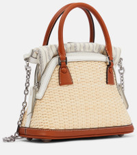 Maison Margiela’s deconstructed approach to design is evident in the 5AC Mini tote. Made from leather-trimmed raffia, it has a folded striped canvas opening and is accented with a logo patch and long detachable strap Product Details - Material: raffia - Trim: leather - Protective leather bottom - Internal details: internal slot pocket, fabric lining - Designer color name: White - Made in Italy - Color of fastening: silver - Closure: zipped top, snap-buttoned fastening - Top handles, Chain shoulder strap - Item number: P00763125 Size & Fit - Min. height 15cm-6" - Max. height 22cm-8.5" - Max. width 22cm-8.5" - Max. depth 10cm-4" - Length of handles 29cm-11.5" - Min. length shoulder strap 116cm-45.5" - Max. length shoulder strap 129cm-51"