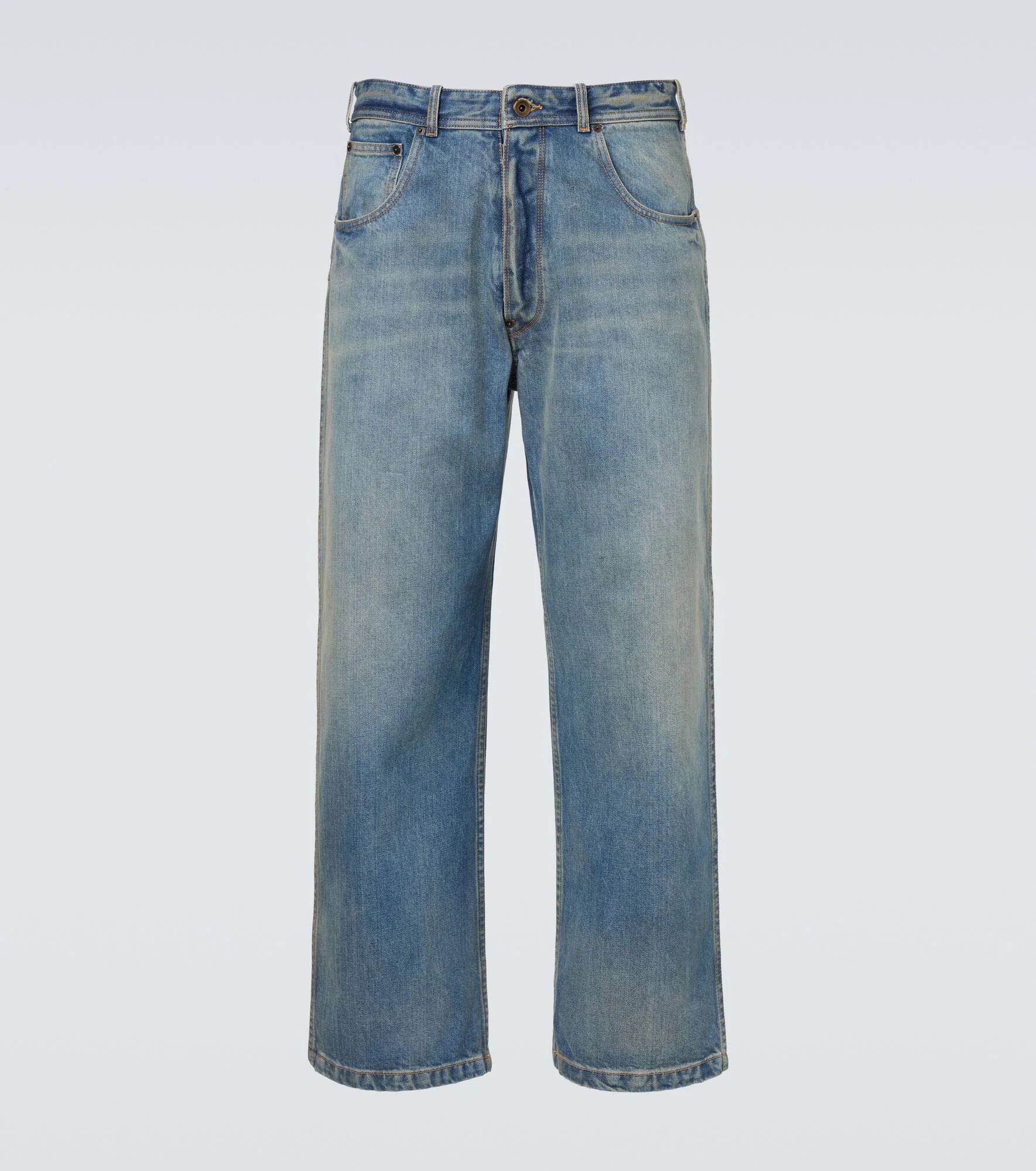 These Maison Margiela jeans are made in Italy and cut to a cropped, straight-leg silhouette. The design is finished with four stitches, highlighting the absence of a traditional garment label. Product Details - Material: 100% cotton - Care instructions: machine wash at 30 degrees - Made in Italy - Color: blue - Designer color name: Washed Blue - Pocket lining: 65% polyester, 35% cotton - Belt loops - Closure: concealed button placket - Pockets: five pockets - Item number: P01130798 Size & Fit - True to size - Non-stretchy fabric - Wide-leg - Mid-rise - Height of model is 189cm-74.5" and wears a size 32