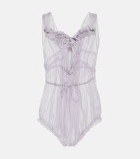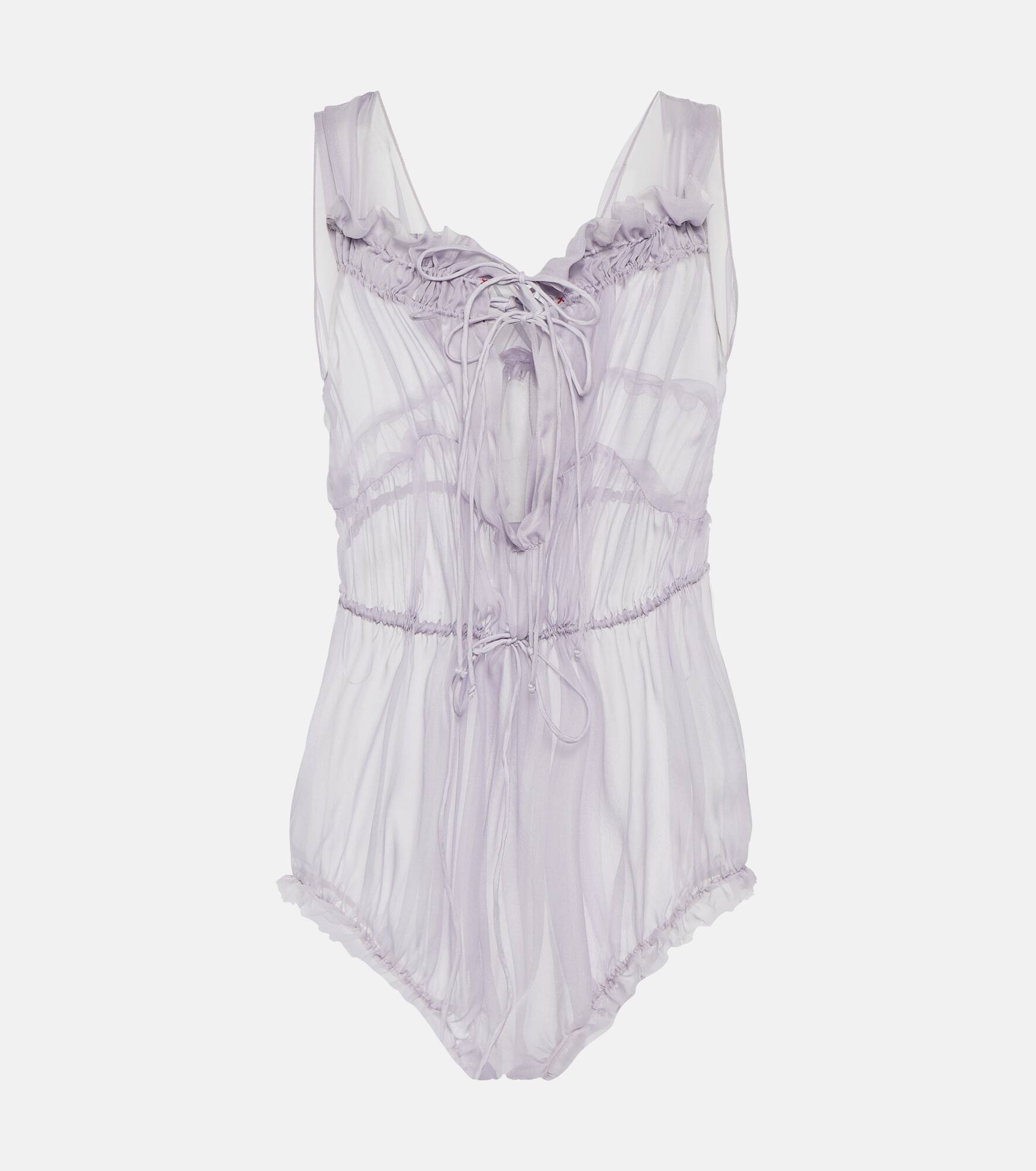 Having shocked audiences with its radical runways and never-before-seen silhouettes in the late ‘80s, Maison Margiela continues to champion bold experimentation. This sheer bodysuit is crafted from featherweight silk and finished with delicate frill trims. Product Details - Made in Italy - Care instructions: dry clean - Material: 100% silk - Designer color name: Lilac - Item number: P00839412 Size & Fit - True to size - Sheer - Loose fit, drawstring waist - Lightweight material - Low-cut leg - The model seen in the picture is 178cm-5'10" and wearing a size IT 40