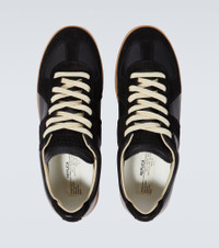This update to Maison Margiela's iconic Replica sneakers sees the sleek silhouette in black with leather uppers, suede trims and debossed logo on the tongue, atop a brown rubber sole. Product Details - Lining: leather - Sole: leather insole, rubber sole - Toe shape: round toe - Upper: calf leather - Trim: lamb leather - Designer color name: Black - Closure: lace-up - Made in Italy - Item number: P00443363 Size & Fit - True to size - Half sizes please take the next size down - European sizes