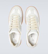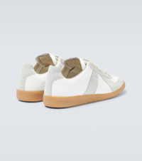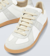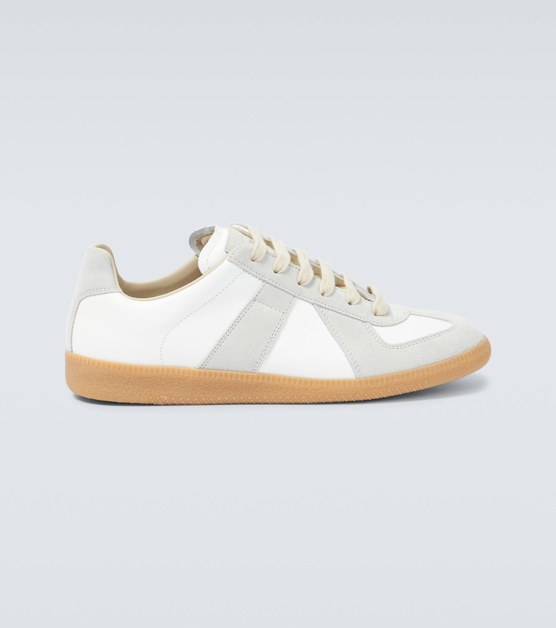 This update to Maison Margiela's iconic Replica sneakers sees the sleek silhouette in a white and grey shade with leather uppers, suede trims and debossed logo on the tongue, atop a brown rubber sole. Product Details - Lining: leather - Sole: leather insole, rubber sole - Toe shape: round toe - Upper: calf leather - Comes with a box - Designer color name: White - Closure: lace-up - Made in Italy - Comes with dust bags - Item number: P00443359 Size & Fit - True to size - European sizes