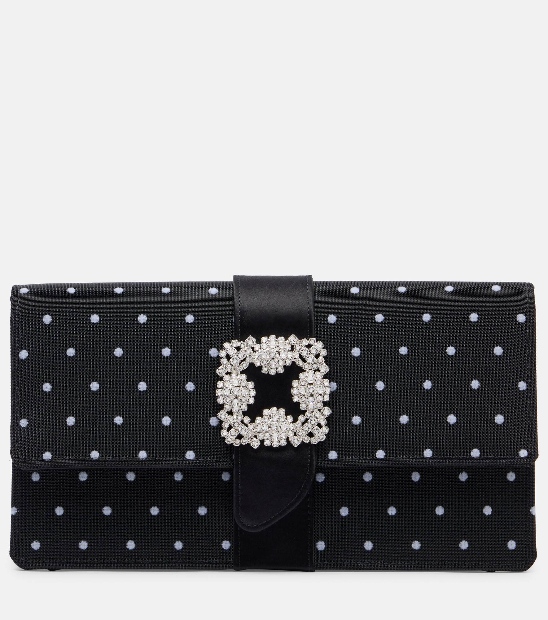 Manolo Blahnik has built his eponymous brand on the pillars of creativity and craftsmanship. The Capri clutch is made from satin with polka dots and an embellished buckle detail. Product Details - Material: satin, fabric - Lining: fabric - Made in Italy - Designer color name: Yoth/Blck - Item color: black, white - Hardware color: silver - Closure: magnetic fastening - Internal details: single compartment, card slot - Detachable shoulder strap - Includes: dust bag, detachable mirror - Item number: P01054817 Size & Fit - Height 13,5cm-5.5" - Width 24,5cm-9.5" - Max. depth 6cm-2.5" - Chain length 44/114cm-17.5/45"