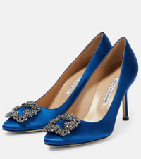 Manolo Blahnik cites historical figures, such as Josephine Bonaparte, and a square jeweled buckle he found in Italy as the inspiration behind the Hangisi. The most iconic shoe in the brand's collection, these timeless pumps are handcrafted in Italy with mesmerizing blue satin uppers, gray crystal embellishments, and 90mm stiletto heels. Product Details - Upper: fabric - Lining: leather - Sole: leather insole and sole - Toe shape: pointed toe - Handmade in Italy - Designer color name: 4326 Bblu - Comes with a box - Comes with dust bags - Item number: P00825043 Size & Fit - Fits slightly large to size - we recommend trying a half size smaller - European sizes - 9cm-3.5" heel (size EU 38)