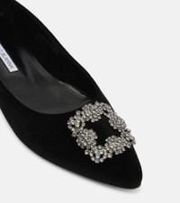 Manolo Blahnik's series of jewel-buckled shoes exemplifies the designer's penchant for sparkling accessories. The Hangisi ballet flats are crafted in Italy with black velvet uppers, almond-shaped toes, and crystal-embellished buckles that sparkle with every step. Product Details - Upper: fabric - Lining: leather - Sole: leather insole and sole - Toe shape: pointed toe - Handmade in Italy - Includes: shoe box - Designer color name: Blck 0015 - Item color: black - Hardware color: silver - Item number: P01093991 Size & Fit - Fits slightly small to size - we recommend trying a half size larger - European sizes