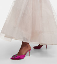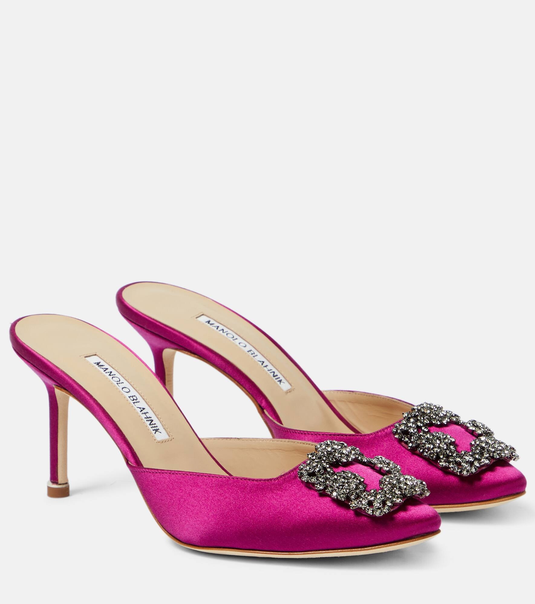 Enriched by a crystal buckle encased in a gunmetal frame, the Hangisimu mules from Manolo Blahnik lend opulence and elegance to every entrance. Handcrafted in Italy, this pair has purple satin uppers that sit atop slender 70mm heels. Product Details - Upper: fabric - Lining: leather - Sole: leather insole and sole - Toe shape: pointed toe - Handmade in Italy - Comes with dust bags - Comes with a box - Item number: P00825088 Size & Fit - True to size - European sizes - 7cm-3" heel (size EU 38)