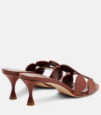Slip into a unique pair of Manolo Blahnik's Haribalmu mules for an understated style statement. The design rests on 50mm heels and features connected circles of supple leather to form eye-catching uppers. Product Details - Upper: leather (nappa) - Lining: leather - Sole: leather insole and sole - Toe shape: almond open toe - Handmade in Italy - Includes: dust bag, shoe box - Designer color name: 2107 Mbrw - Item color: brown - Item number: P01073688 Size & Fit - True to size - European sizes - 5cm-2" heel (size EU 38)