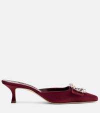 Step into glamour with the Mayjou mules from Manolo Blahnik. Crafted with burgundy-hued satin uppers, the pair boasts signature crystal-embellished buckles and 50mm heels. Product Details - Upper: satin - Lining: leather - Sole: leather insole and sole - Color: burgundy - Toe shape: pointed toe - Handmade in Italy - Includes: shoe box, dust bag - Designer color name: 6038 Dred - Item color: burgundy - Item number: P01135088 Size & Fit - True to size - Slightly wide - European sizes - 5cm-2" heel