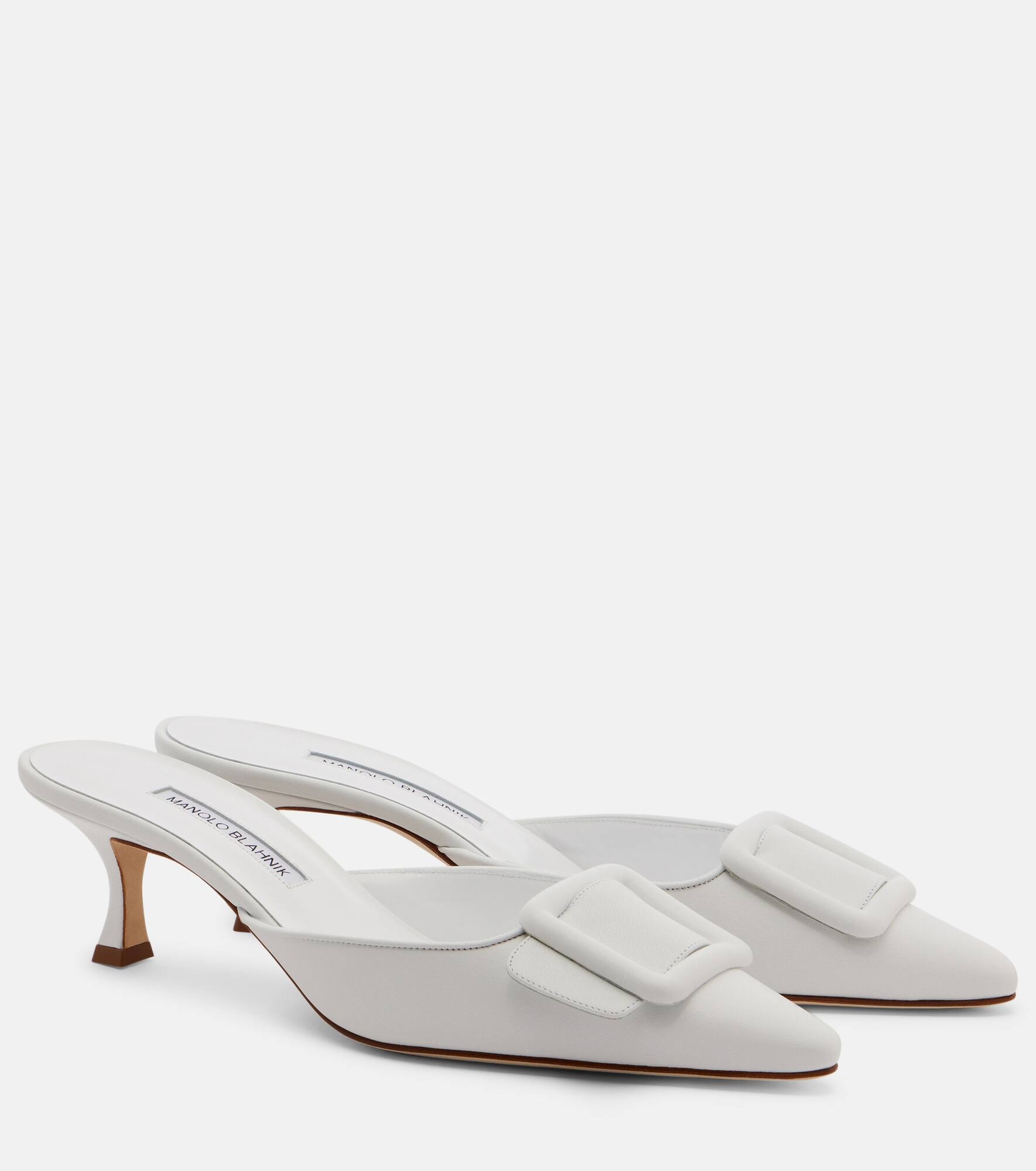 Crafted in Italy from leather, the Maysale mules from Manolo Blahnik showcase square buckles at the front. This design features leather insoles and soles on pointed-toe silhouettes. Product Details - Upper: leather - Lining: leather - Sole: leather insole and sole - Toe shape: pointed toe - Handmade in Italy - Includes: shoe box, dust bag - Designer color name: White - Item color: white - Item number: P01072663 Size & Fit - True to size - European sizes - 5cm-2" heel (size EU 38)