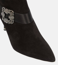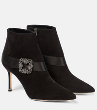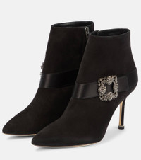 Manolo Blahnik's series of jewel-buckled shoes exhibit the designer's penchant for dazzling accessories. The Plinianu ankle boots are one such example, handcrafted from suede in Italy and decorated with a satin strap and crystals. Product Details - Upper: goat leather - Lining: leather - Sole: leather insole and sole - Toe shape: pointed toe - Handmade in Italy - Designer color name: 0015 Blck - Trim: fabric - Comes with dust bags - Closure: zipped side - Comes with a box - Item number: P00816784 Size & Fit - True to size - European sizes - 9cm-3.5" heel (size EU 38)