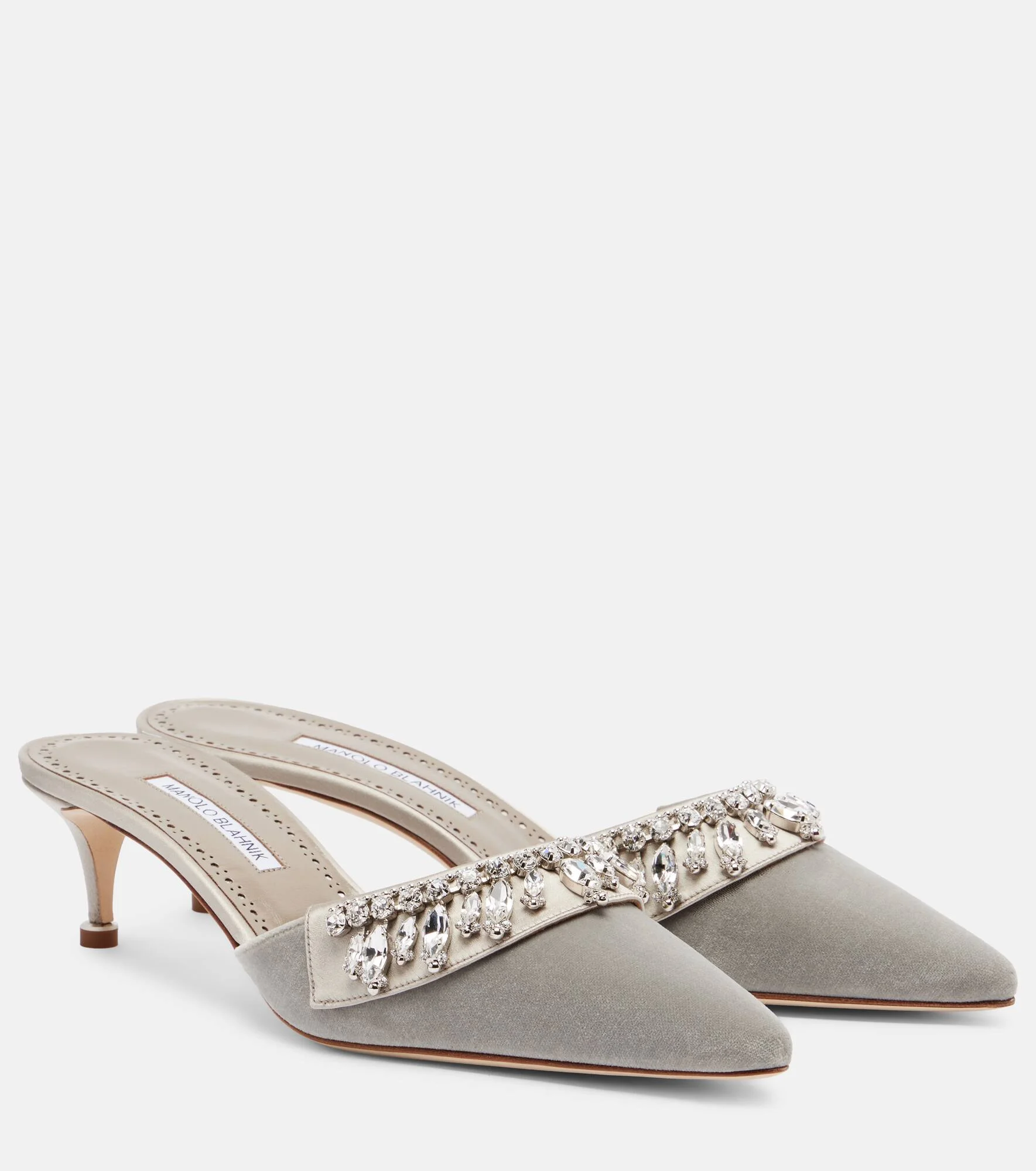 One of the world's most celebrated shoe designers, Manolo Blahnik has built his eponymous brand on the pillars of creativity and craftsmanship. Made in Italy from grey velvet, the Tulipe mules are a pointed-toe pair with crystal embellishments and 50mm kitten heels. Product Details - Upper: velvet, polyester - Lining: leather - Sole: leather insole and sole - Color: grey - Toe shape: pointed toe - Handmade in Italy - Includes: shoe box, dust bag - Designer color name: 0308 Mgry/0502 Lgry - Item color: gray - Item number: P01132192 Size & Fit - True to size - European sizes - 5cm-2" heel