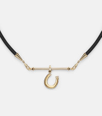 Marie Lichtenberg channels timeless romance through contemporary craftsmanship, creating pieces rich in meaning and refined detail. This necklace is crafted from 18kt gold (750/1000) with a 500mm leather lasso, complemented by a dangling Horseshoe pendant adorned with six shimmering pave diamonds. Product Details - Material: 18kt yellow gold (750/1000), leather - Made in Thailand - Item color: gold, brown - Color: brown - Stone I: 6 diamonds, 0.09ctw, round-cut, pave setting, SI1 clarity grade, H color grade - This piece features natural diamonds only - diamond - Item number: P01118658 Size & Fit - Length when open 43,5cm-17" - Length when open 56cm-22" - Max. width 4mm-0.15" - Pendant length 34mm-1.35" - Pendant width 65mm-2.55"
