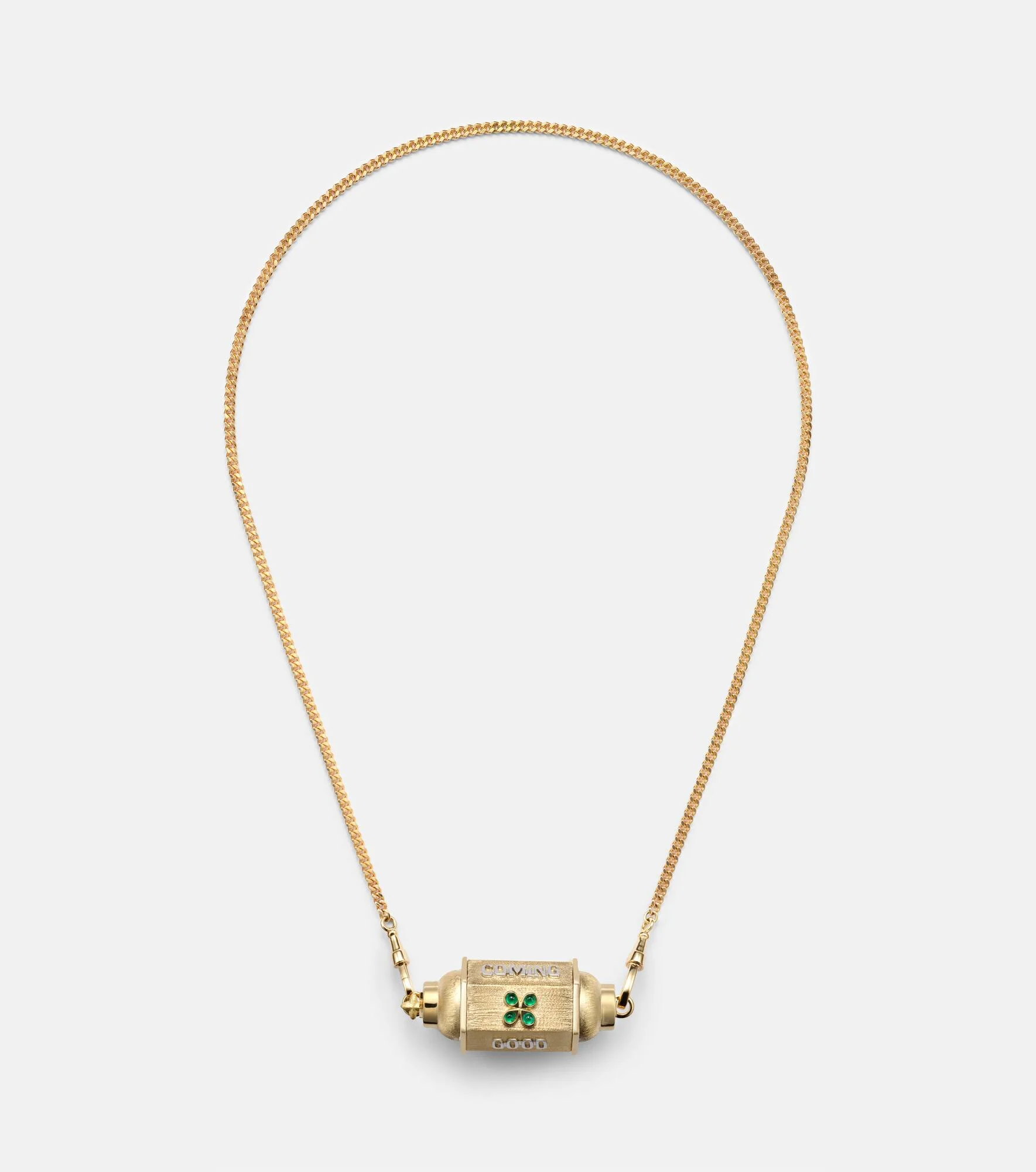 Infused with sentimental value, Marie Lichtenberg's modern heirlooms are destined to be treasured forever. Crafted from 18kt yellow gold and hanging from a gourmette chain, this necklace showcases a locket finished with the "Good Things" motto and cabochon emeralds – set to recall a clover. Product Details - Material: 18kt yellow gold (750/1000) - Made in Italy - Item color: gold - Color: gold - Stone I: 8 emeralds, round-cut, bezel setting, 0.22ctw - Closure: lobster-clasp fastening - Item number: P01118678 Size & Fit - Length when open 40,5cm-16" - Width 2mm-0.1" - Pendant length 15mm-0.6" - Pendant width 38mm-1.5"
