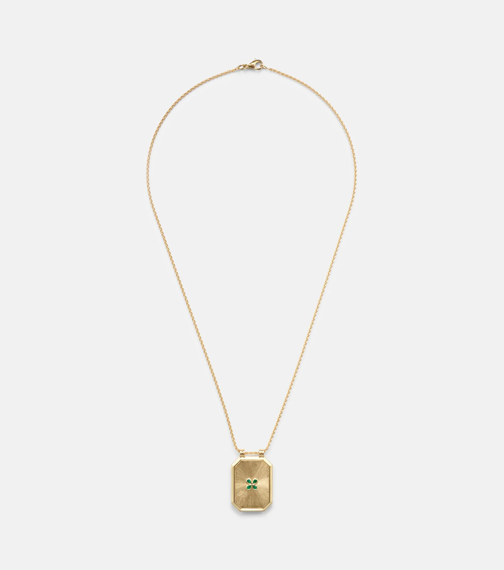 Timeless value and emotional significance lay the groundwork for every Marie Lichtenberg creation. The Luck necklace is meticulously crafted from gleaming 18kt yellow gold and features a refined pendant suspended from the brand's signature Spiga chain. Showcasing unmatched artistry, the exquisite style is complete with dazzling emeralds arranged in a clover-like motif. Product Details - Material: 18kt yellow gold (750/1000) - Made in Italy - Item color: gold - Color: gold - Stone I: emerald, 0.11ctw, pear-shaped, bezel setting - emerald - Item number: P01118654 Size & Fit - Length when open 44,5cm-17.5" - Width 1,5mm-0.05" - Pendant length 34mm-1.35" - Pendant width 18mm-0.7"