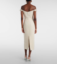 Markarian channels celestial glamour through couture-level silhouettes and a distinctly romantic perspective. Made from wool-blend jacquard, the Amina bridal midi dress is a flattering off-shoulder design adorned with a floral pattern. Product Details - Material: 69% wool, 31% viscose - Care instructions: spot clean - Made in the USA - Color: white - Designer color name: Off White Floral Jacquard - Lining: 100% silk - Boning - Closure: concealed zipped back - Long vent - Item number: P01152648 Size & Fit - True to size - Off-the-shoulder - Internal boned corset for support - Fitted - Non-stretchy fabric - The model seen in the picture is 178cm-5'10" and wearing a size US 4