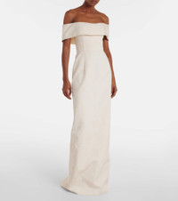 The Clover gown from Markarian is a timeless design cut from floral brocade. The classic column silhouette features a corset-inspired bodice and a flattering off-shoulder neckline. Product Details - Material: 62% polyester, 24% cotton, 14% acrylic - Care instructions: dry clean - Made in the USA - Designer color name: Ivory - Item color: ivory - Closure: zipper, hook fastening - Lining: 100% silk - Fully lined - Contains non-textile parts of animal origin - Boning - Item number: P01052006 Size & Fit - True to size - Off-the-shoulder - Internal boned corset for support - Cinched waist - Non-stretchy fabric - slit length 77,0cm-30.5" - The model seen in the picture is 178cm-5'10" and wearing a size US 4