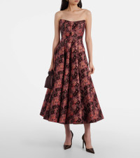 Markarian channels celestial glamour through couture-level silhouettes and a distinctly romantic perspective. The Rousseau brocade midi dress is adorned with a floral motif and designed with a strapless, structured bodice that flows seamlessly into a flared, voluminous skirt. Product Details - Material: 60% polyester, 20% nylon, 20% metallic fibres - Care instructions: dry clean - Made in the USA - Designer color name: Burgundy Metallic Daisy - Item color: multicolor - Lining: 100% silk - Boning - Hook-fastening built-in bustier - Closure: concealed zipped back, hook-fastening back - Item number: P01094026 Size & Fit - True to size - Strapless - Internal boned corset for support - Non-stretchy fabric - The model seen in the picture is 178cm-5'10" and wearing a size US 4
