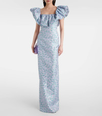 As ethereal as it is elegant, Markarian's Rowan gown is intricately, expertly crafted from floral brocade that offers a light shimmer. It's shaped into a column silhouette with a delicately puffed bodice and center-back slit for a comfortable drape. Product Details - Material: 43% polyester, 39% viscose, 18% metallic fibres - Care instructions: dry clean - Made in the USA - Designer color name: Teal / Purple - Item color: blue - Item number: P01023232 Size & Fit - True to size - Off-the-shoulder - Internal boned corset for support - Cinched waist - Non-stretchy fabric - slit length 72cm-28.5" - The model seen in the picture is 178cm-5'10" and wearing a size US 4