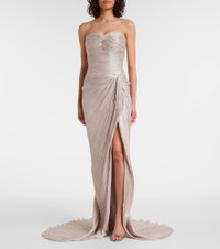 Strapless draped metallic plissé-silk gown and cape Taupe