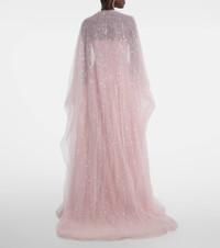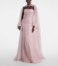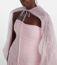 Celebrate special moments in unforgettable designs by Marmar Halim, like this glamorous gown. This style features a strapless design with elegant pleats, an internal bustier, and a stylish cape that enhances the overall look. Product Details - Material: 100% polyester - Care instructions: dry clean - Made in the United Arab Emirates - Designer color name: Pink - Item color: pink - Lining: 100% polyester - Hook-fastening built-in bustier - Closure: concealed zipper, zipped back, hook-fastening back - Item number: P01077211 Size & Fit - Fits small to size - we recommend trying one size larger - Strapless - Internal corset with underwire support - Fitted bodice, loose skirt - Loose outer layer - Non-stretchy fabric - Padded top - The model seen in the picture is 178cm-5'10" and wearing a size FR 38