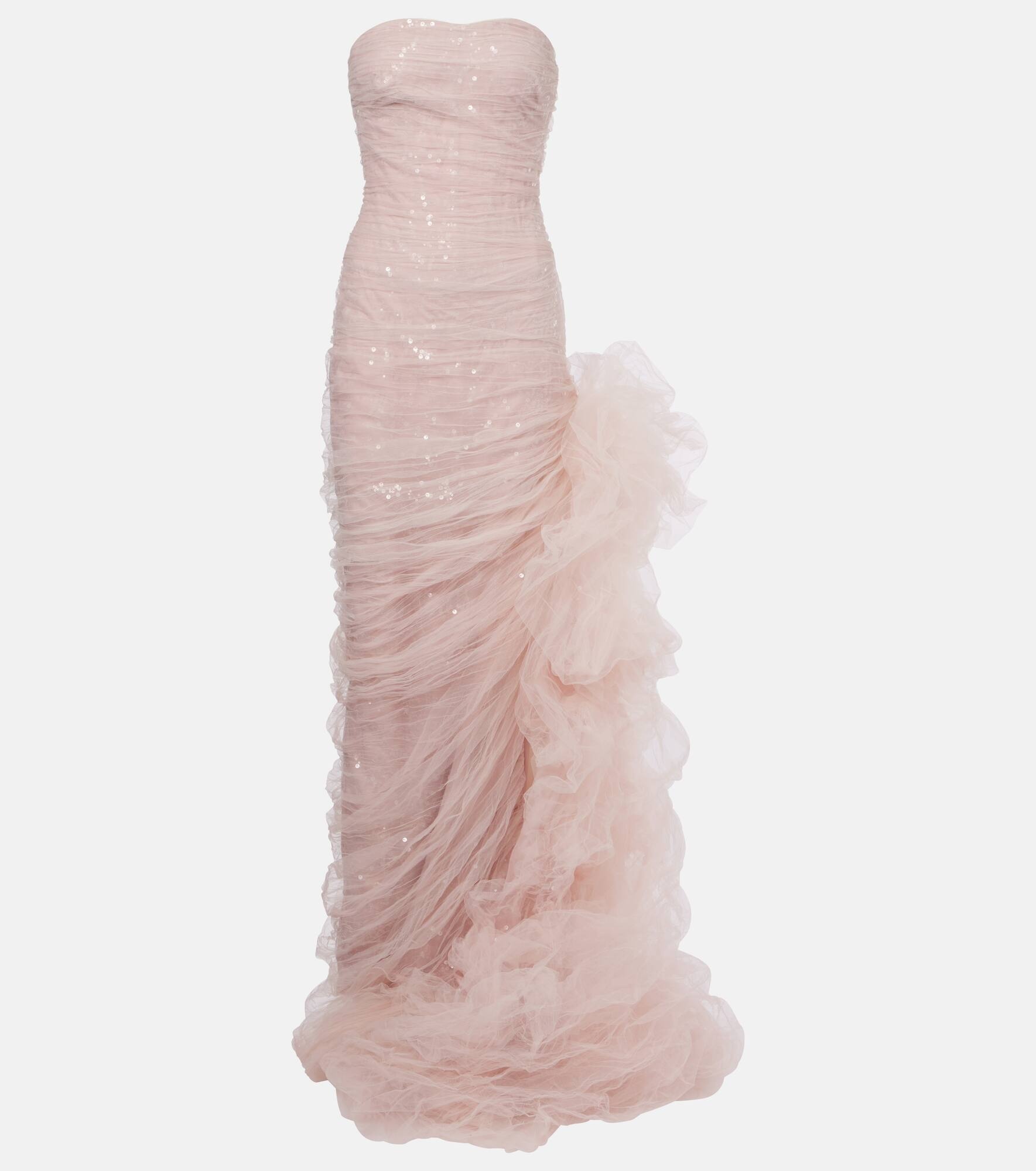 Make a show-stopping entrance in this striking gown from Marmar Halim. Crafted from ruched tulle with embellished with sequins, this strapless style features dramatic ruffles cascading down to the side. Product Details - Material: 80% silk, 20% nylon - Care instructions: dry clean - Made in China - Designer color name: Pink - Item color: pink - Closure: zipped back, hook-fastening back - Item number: P01031061 Size & Fit - Fits small to size - we recommend trying one size larger - Strapless - Internal corset with underwire support - Fitted - Non-stretchy fabric - The model seen in the picture is 178cm-5'10" and wearing a size FR 38