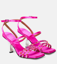 Perfect for party season, these fuschia pink sandals from Marni will be the statement piece of any outfit. Made from satin, the strappy style is decorated with colorful crystals and has silver metallic heels. Product Details - Upper: fabric - Lining: fabric - Sole: fabric insole, leather sole - Toe shape: square open toe - Made in Italy - Designer color name: Fuchsia - Comes with a box - Comes with dust bag - Closure: buckle-fastening ankle strap - Item number: P00813459 Size & Fit - True to size - European sizes - 8,5cm-3.5" heel (size EU 38)