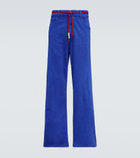 This characterful take on tailoring spotlights Marni's vibrant vision. Made of stretchy cotton twill weave, these mid-rise pants are detailed with a branded shoelace-inspired waist tie, five-pocket styling, and a rear logo patch. Product Details - Pockets: five pockets - Made in Italy - Care instructions: machine wash at 30 degrees - Designer color name: Bluette - Closure: zipper fly, button fastening - Fringed ends - Material: 97% cotton, 3% elastane - Item number: P00789536 Size & Fit - Fits large to size - we recommend trying one size smaller - Mid-weight material - Stretchy fabric - Wide-leg - The model in the picture is 185cm-6'1" and wearing a size 31