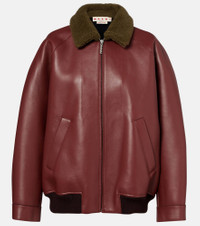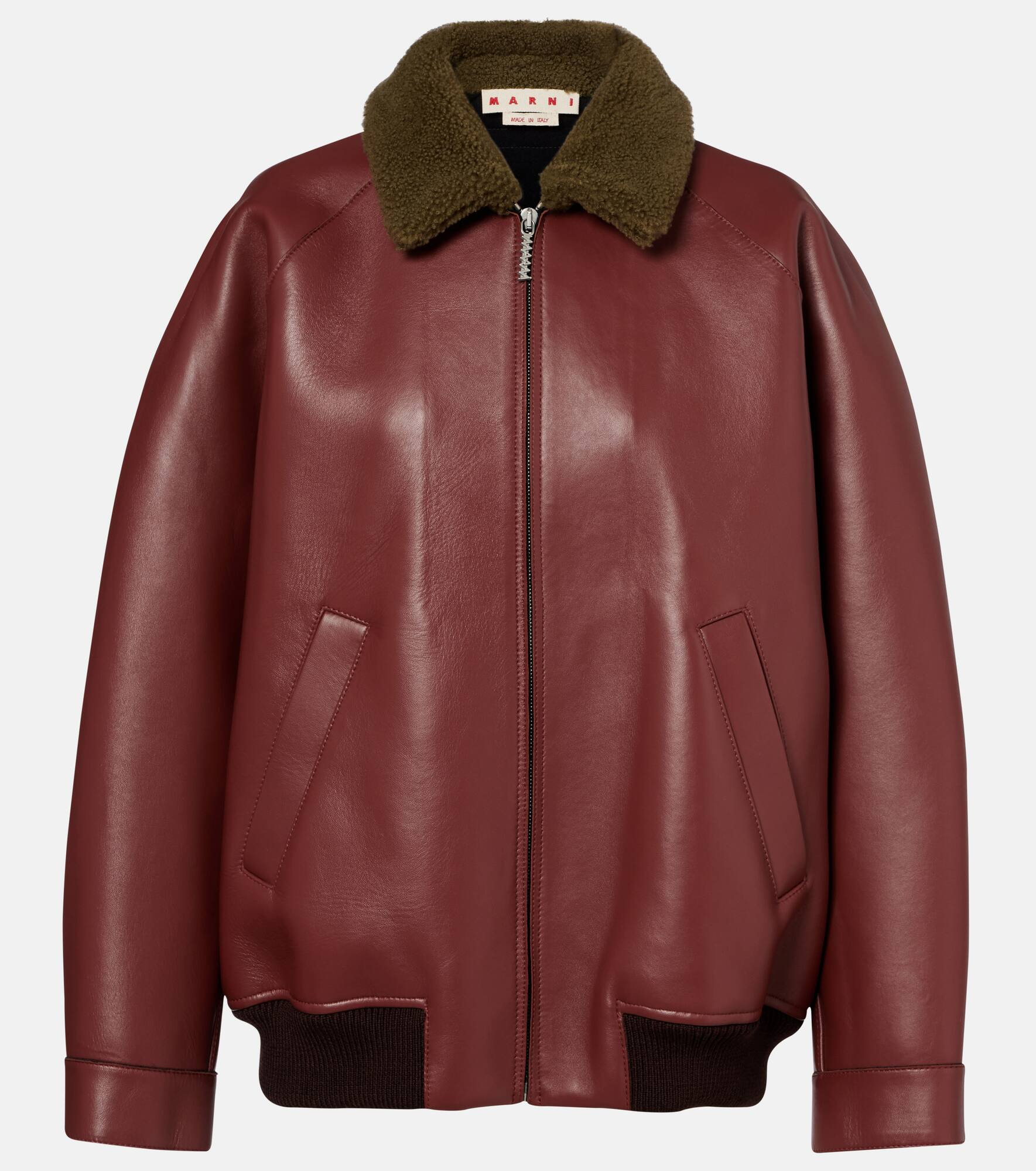 Every wardrobe needs high-end outerwear like this Marni blouson jacket. Crafted from supple lamb leather, the design features a zipped front, a shearling collar, and a wool-blend ribbed waistband. Product Details - Material: 100% lamb leather - Care instructions: specialist clean - Made in Italy - Designer color name: Peat - Item color: burgundy - Material II: 75% wool, 20% polyamide, 5% cashmere - Pocket lining: 100% cotton - Details: 100% shearling - Contains non-textile parts of animal origin - Hardware color: silver - Closure: zipped front - Cuff: buttoned - Pockets: slant pockets - Hem: ribbed - Includes: dust bag - Item number: P01058584 Size & Fit - Fits large to size - we recommend trying one size smaller - Designed for a loose fit - Elasticated hem - Stiff material - Non-stretchy fabric - Falls below the hip - The model seen in the picture is 178cm-5'10" and wearing a size IT 38