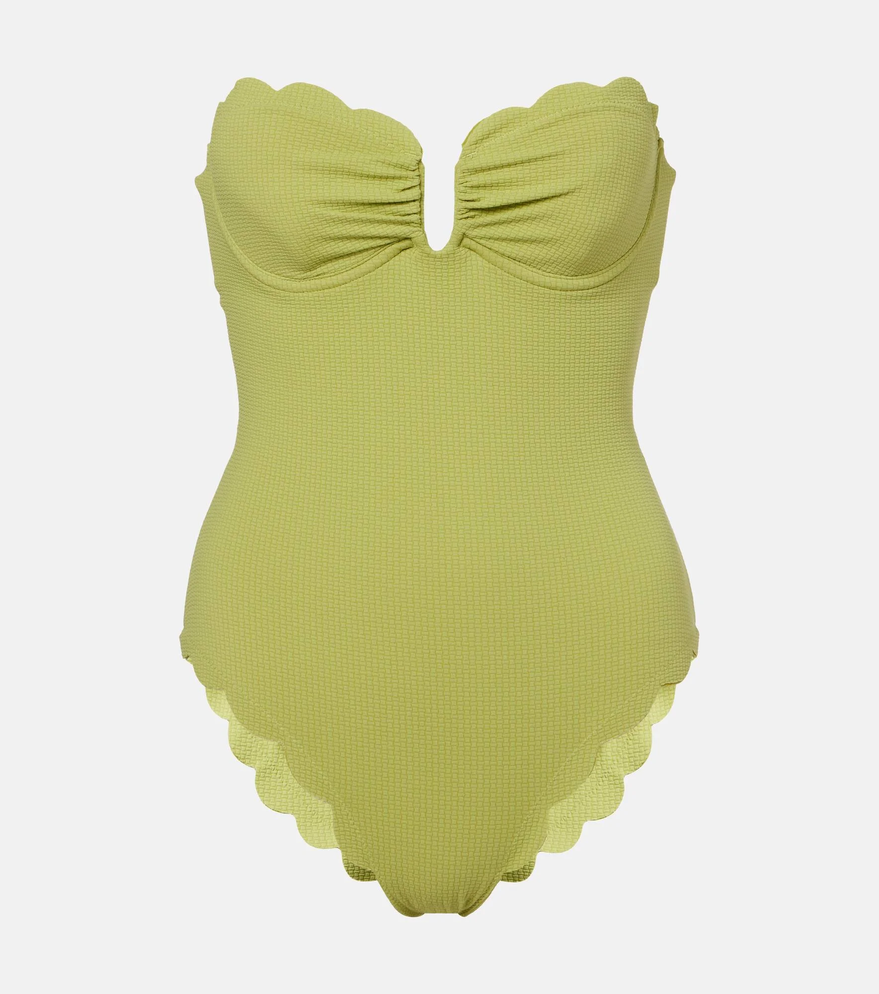 Marysia’s most recognizable feature is the hand-cut scalloped edges that do without stitching or elastic for a more flattering fit. The Lisbon swimsuit is a strapless style with a cutout at its back. Product Details - Material: 88% polyamide, 12% elastane - Care instructions: hand wash - Made in Portugal - Color: green - Designer color name: Serpentine - Item color: green - Underwired cups - Closure: clip fastening - Item number: P01075474 Size & Fit - True to size - Petite sizing - Strapless - Underwired top - Unpadded Top - Medium-cut leg - The model seen in the picture is 178cm-5'10", cup size B, and wearing a size XS