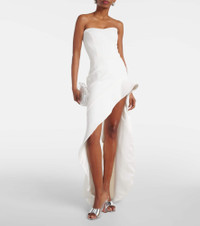 Product Details - Material: 100% polyester - Care instructions: dry clean - Made in Australia - Designer color name: White - Lining: 93% silk, 7% elastane - Boning - Closure: zipped back - Item number: P00889641 Size & Fit - True to size - Ideal fit for larger bust sizes - Strapless - Internal boned corset for support - Fitted - Non-stretchy fabric - slit length 107,0cm-42" - The model seen in the picture is 178cm-5'10" and wearing a size UK 8