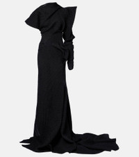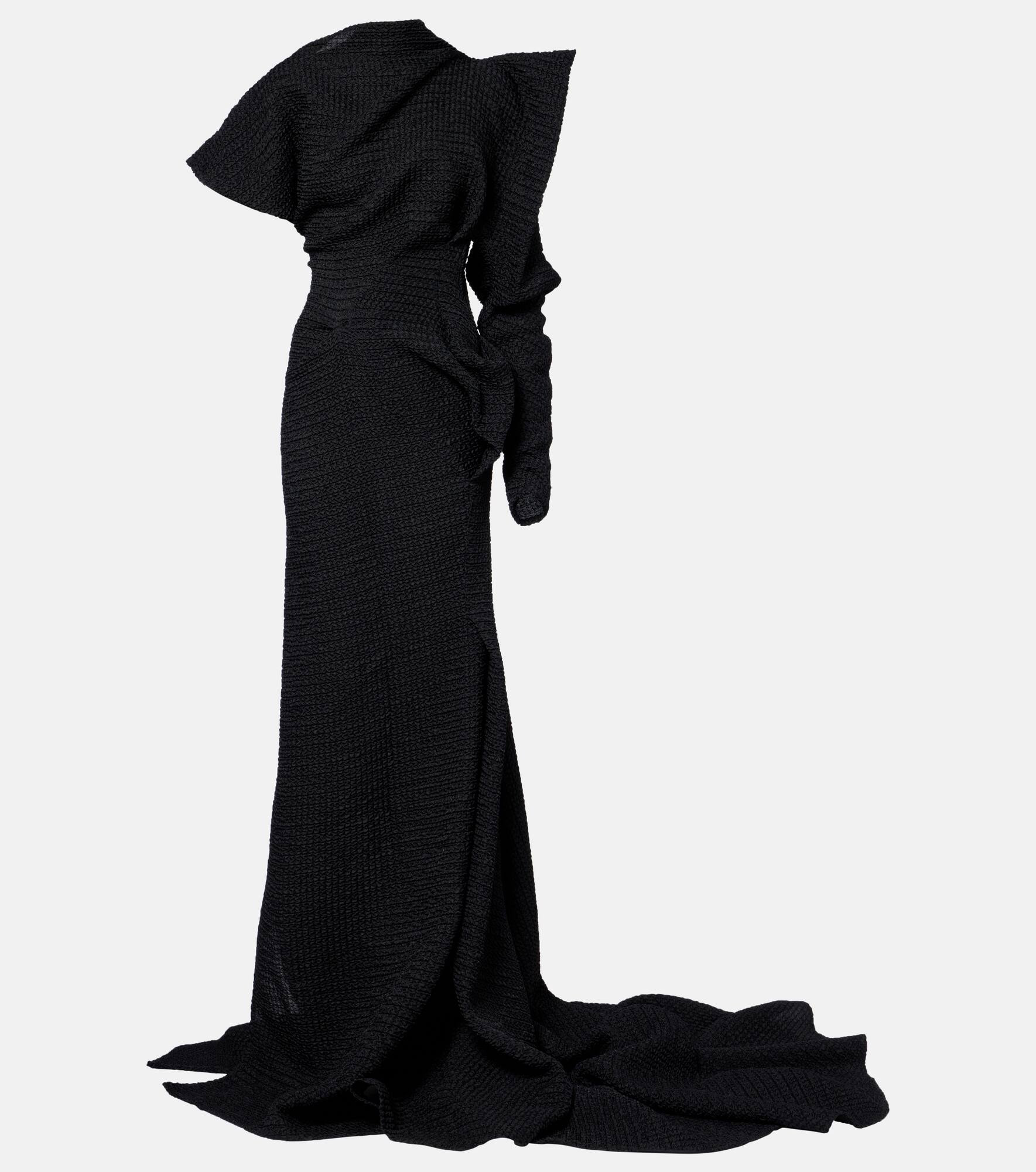 The Lyra asymmetric draped gown from Maticevski is a wearable work of art. Made from a textural, waffle-weave fabric, the sculptural design features an asymmetric hemline, cape-like draping, and layered puff-sleeves. Product Details - Material: 64% viscose, 21% silk, 11% polyamide, 4% elastane - Care instructions: specialist clean - Made in Australia - Designer color name: Black - Item color: black - Closure: zipped side - Hem: uneven - Item number: P01079598 Size & Fit - True to size - Sizing adapted to taller women - Fitted - Stretchy fabric - The model seen in the picture is 178cm-5'10" and wearing a size UK 8