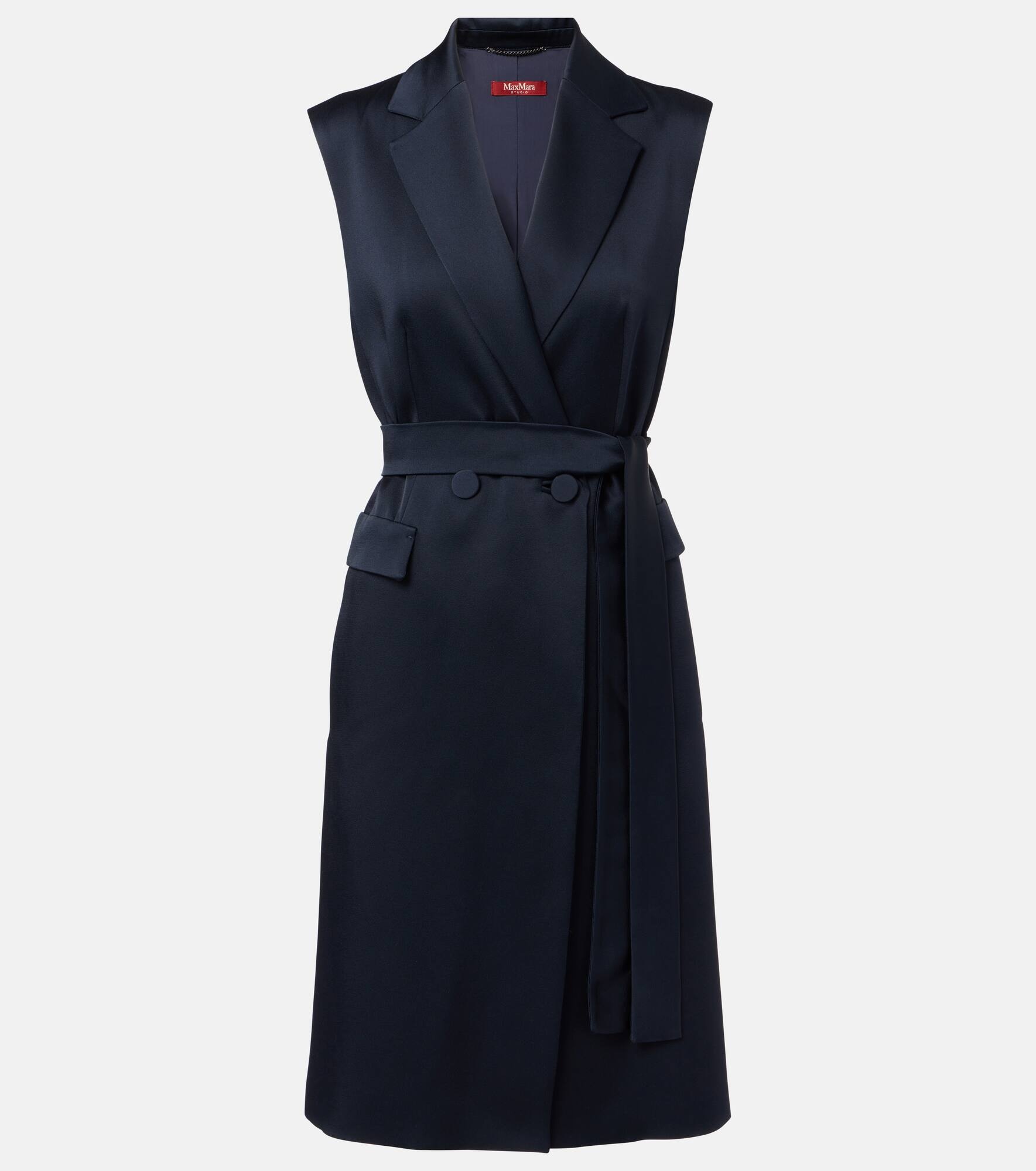 Boasting a rich manufacturing history, Max Mara represents the quintessence of Italian sophistication and expertise. Crafted from lustrous satin, the Afgano jacket is shaped into a sleeveless design with a double-breasted front and figure-flattering belted waist. Product Details - Material: 71% acetate, 29% viscose - Care instructions: dry clean - Made in Poland - Designer color name: Blu Notte - Item color: blue - Lining: 85% acetate, 10% silk, 5% polyamide - Closure: double-breasted buttoned front - Pockets: side slit pockets - Notched lapel - Detachable belt - Shoulder pads - Item number: P01077386 Size & Fit - True to size - Cinched waist - Non-stretchy fabric - Falls below the hip - DT = German size - The model seen in the picture is 178cm-5'10" and wearing a size DE 34