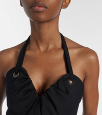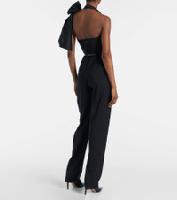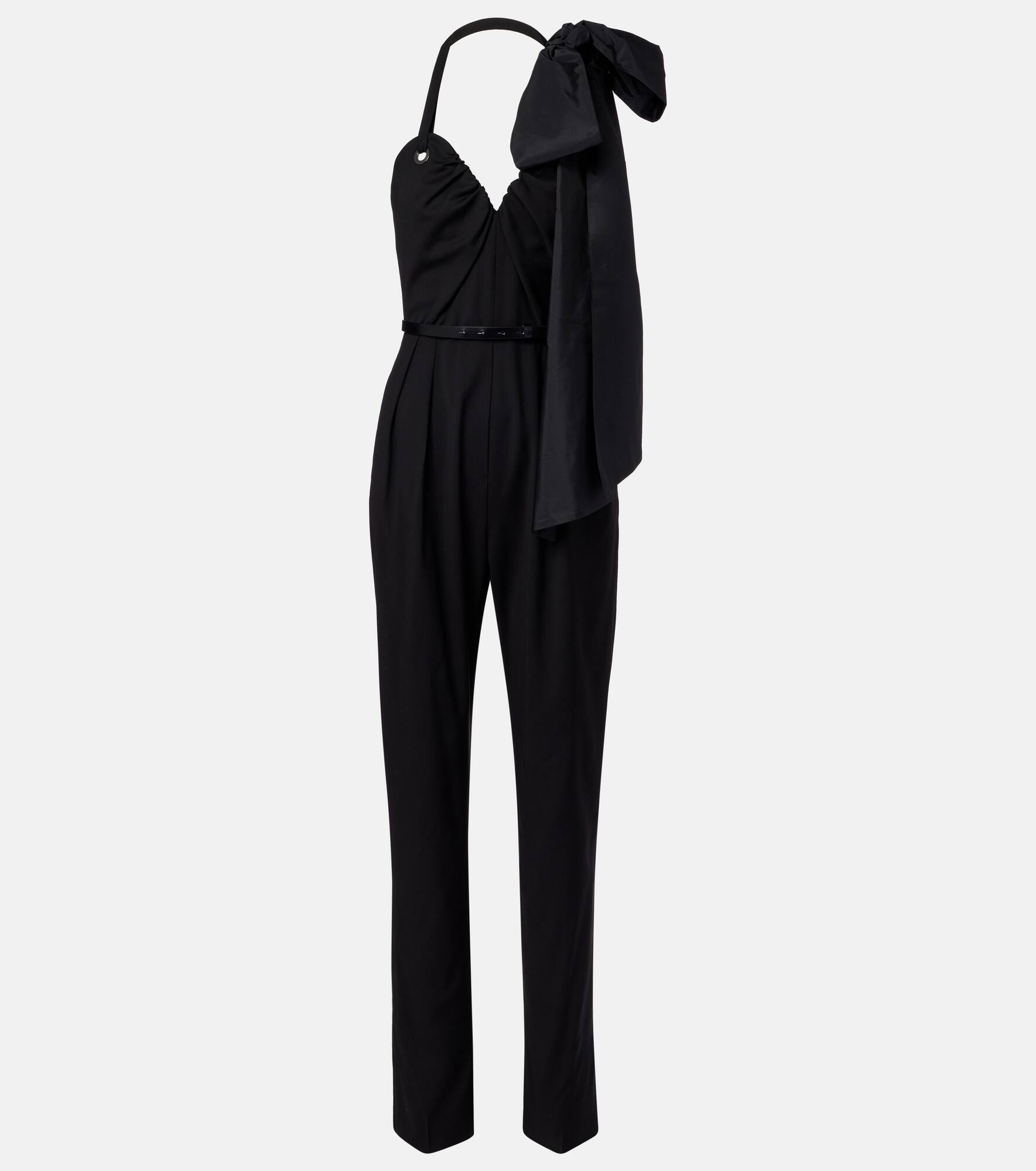Crafted in Italy from virgin wool, this jumpsuit from Max Mara showcases a bow-detail on one shoulder. This design features boning at the bodice and double pleats at the legs. Product Details - Material: 100% virgin wool - Care instructions: dry clean - Made in Italy - Designer color name: Black - Item color: black - Material II: 75% polyester, 25% silk - Lining: 100% cotton - Material III: 100% calf leather - Boning - Closure: zipped back - Four-piece set - Detachable halterneck ties - Detachable band - Detachable belt - Hem: unfinished (ready for alteration) - Item number: P01079565 Size & Fit - True to size - Strapless - Internal laced corset for support - Cinched waist - Non-stretchy fabric - Straight leg - High-waisted - Unhemmed for tailoring - The model seen in the picture is 178cm-5'10" and wearing a size DE 34