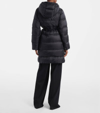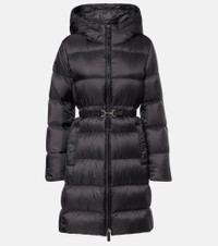 Boasting a rich manufacturing history, Max Mara represents the quintessence of Italian sophistication and expertise. This classic down coat features horizontal quilting, a large hood, and an elasticated belt to cinch the waist. Product Details - Material: 100% polyester - Care instructions: machine wash at 30 degrees - Made in Armenia - Designer color name: Black - Item color: black - Lining: 100% polyester - Filling: 90% down, 10% feathers - Contains non-textile parts of animal origin - Closure: two-way zipped front - Pockets: snap-buttoned pockets - Hood - Cuff: elasticated - Elasticated waistband - Detachable belt - Item number: P01093452 Size & Fit - True to size - Loose fit, elasticated waist - Non-stretchy fabric - The model seen in the picture is 178cm-5'10" and wearing a size DE 34
