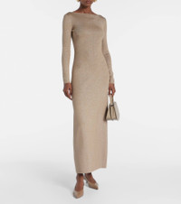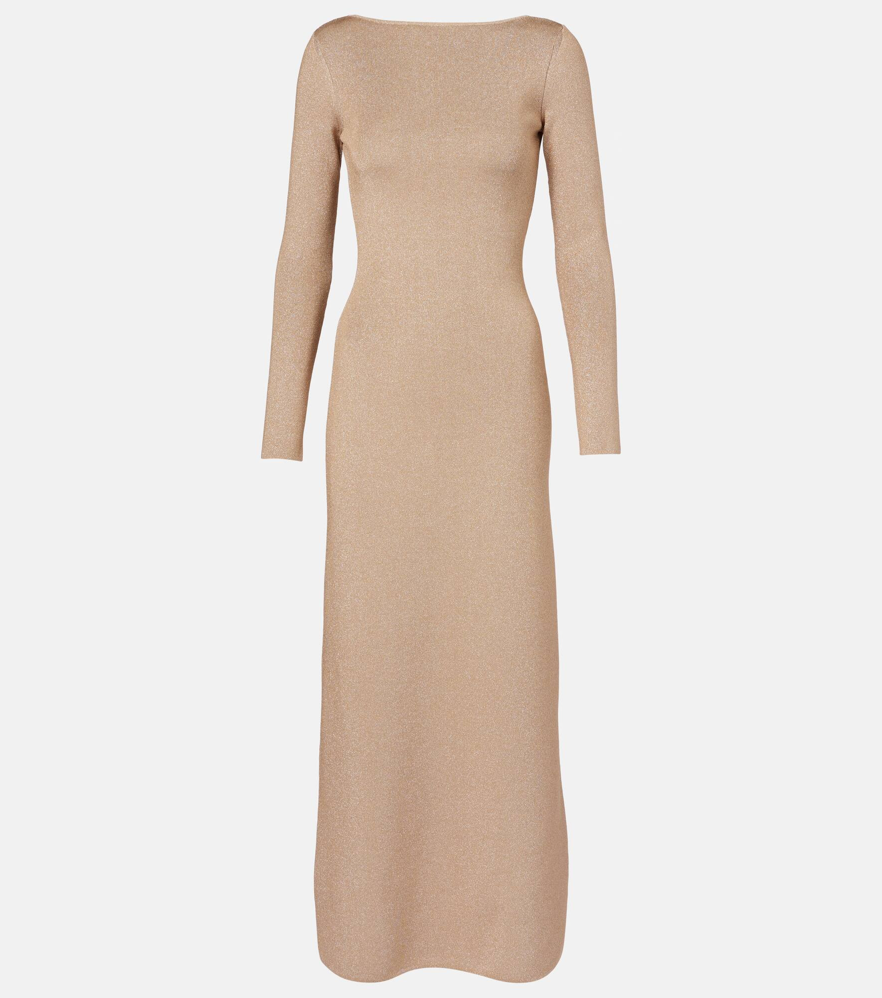 This open-back maxi dress features a deep V-neckline at the back and is cut to a fitted silhouette. Boasting a rich manufacturing history, Max Mara represents the quintessence of Italian sophistication and expertise. Product Details - Material: 67% viscose, 17% metallic fibres, 15% polyamide, 1% elastane - Care instructions: dry clean - Made in Romania - Designer color name: Pomice Argento - Item color: beige - Item number: P01077399 Size & Fit - True to size - Low back - Fitted - Stretchy fabric - The model seen in the picture is 178cm-5'10" and wearing a size XS