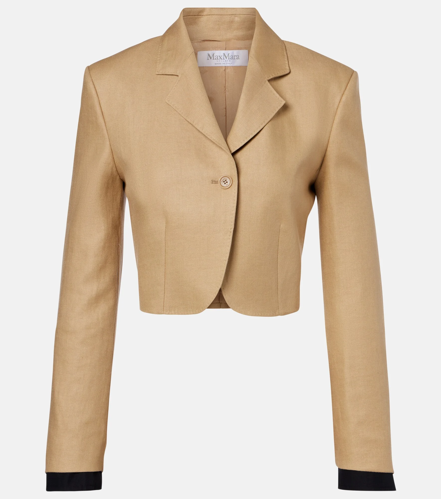 Boasting a rich manufacturing history, Max Mara represents the quintessence of Italian sophistication and expertise. Blending contemporary style with classic tailoring, the Buono blazer is made from pure linen into a cropped silhouette. Product Details - Material: 100% linen - Care instructions: dry clean - Made in Italy - Color: beige - Designer color name: Sand - Material II: 100% cotton - Lining: 65% acetate, 35% polyester - Shoulder pads - Closure: single-breasted (one button) - Cuff: four buttons - Notched lapel - Item number: P01158175 Size & Fit - True to size - Shoulder pad inserts - Cinched waist - Non-stretchy fabric - Cropped - The model seen in the picture is 178cm-5'10" and wearing a size DE 34