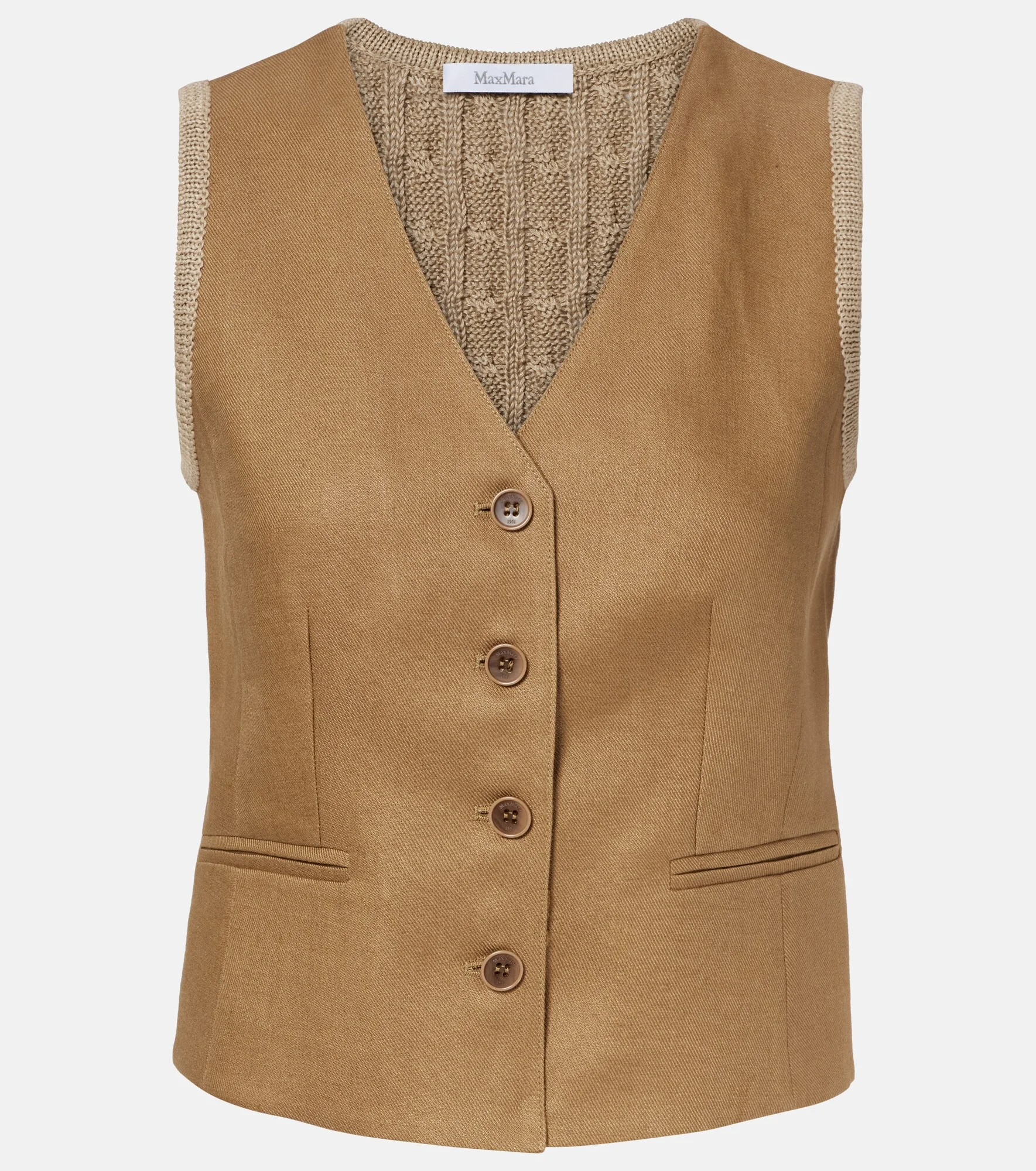 Boasting a rich manufacturing history, Max Mara represents the quintessence of Italian sophistication and expertise. Made from pure linen, the Calibri vest is a tailored style with a cable-knit back. Product Details - Material: 100% linen - Care instructions: hand wash - Made in Romania - Color: brown - Designer color name: Solido Deserto - Closure: single-breasted - Pockets: jetted - Material II: 100% linen - Cuff: ribbed - Item number: P01149987 Size & Fit - True to size - Straight fit - Partly stretchy fabric - Slightly cropped - The model seen in the picture is 178cm-5'10" and wearing a size XS