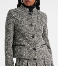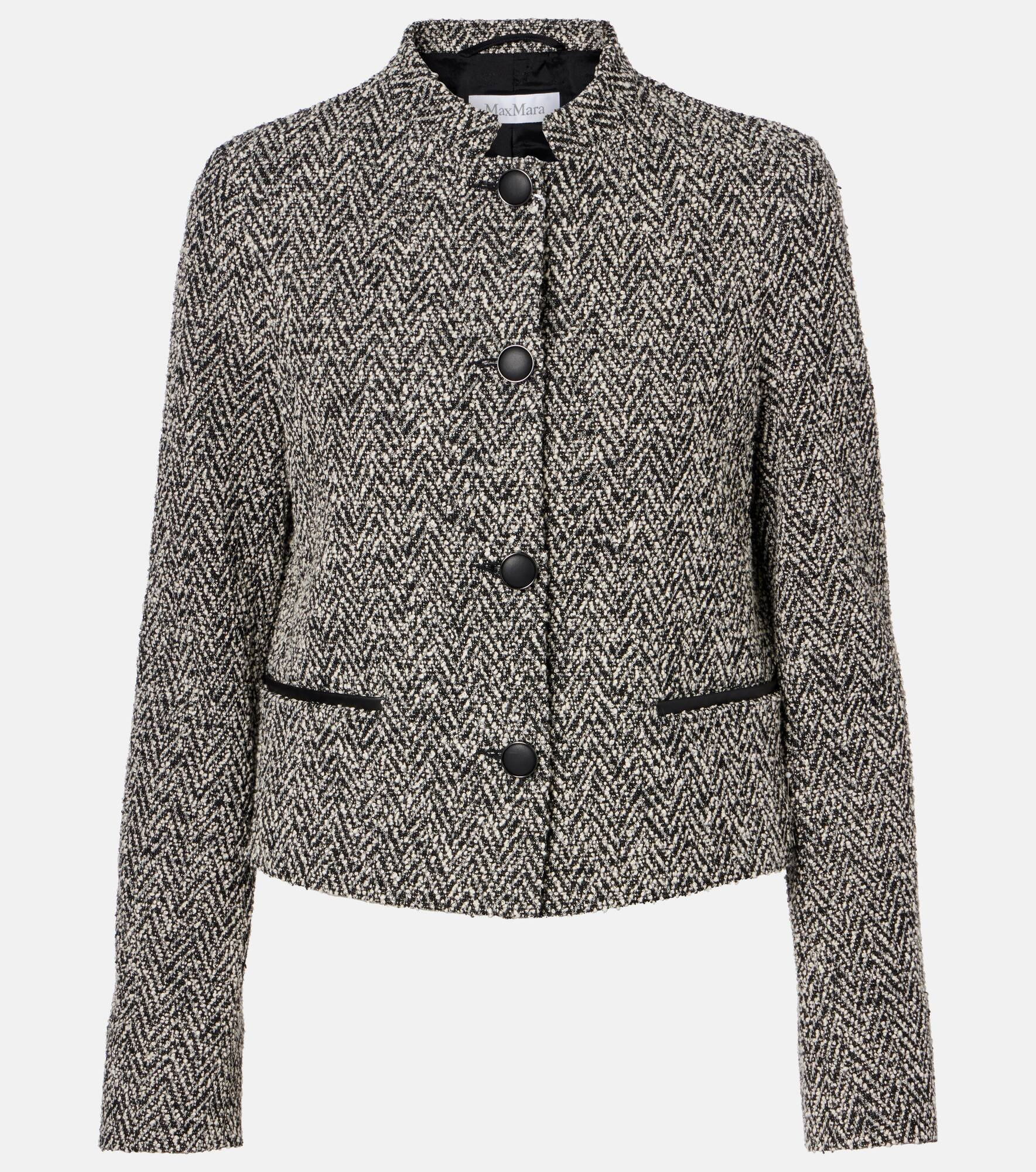 The Donald jacket from Max Mara exudes timeless sophistication for a wide range of looks. Crafted from a cotton and wool blend, this piece showcases a chevron pattern and is designed with structured shoulders and a buttoned front. Product Details - Material: 48% cotton, 37% wool, 10% polyester, 4% polyamide, 1% elastane - Care instructions: dry clean - Made in Romania - Designer color name: Dis. Chevron - Item color: black, white - Closure: buttoned front - Pockets: welt pockets - Lining: 65% acetate, 35% polyester - Contains non-textile parts of animal origin - Trim: 100% leather - Length: short (waist-length) - Item number: P01090707 Size & Fit - True to size - Shoulder pad inserts - Straight fit - Non-stretchy fabric - Cropped - The model seen in the picture is 178cm-5'10" and wearing a size DE 34