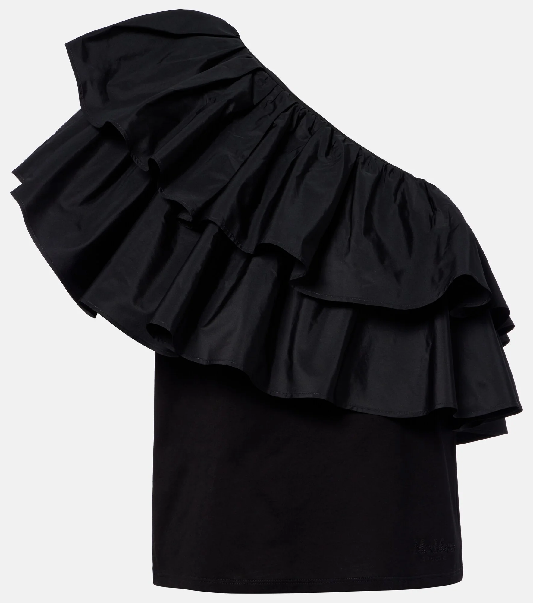 Boasting a rich manufacturing history, Max Mara represents the quintessence of Italian sophistication and expertise. Part of the Elegante line, the Orca top is made from soft cotton jersey in a one-shoulder silhouette, enhanced with a wide contrast taffeta ruffle along the neckline. Product Details - Material: 100% cotton - Care instructions: hand wash - Made in Romania - Color: black - Designer color name: Nero - Material II: 75% polyester, 25% silk - Item number: P01152491 Size & Fit - True to size - Straight fit - Partly stretchy fabric - Falls to the hip - The model seen in the picture is 178cm-5'10" and wearing a size XS