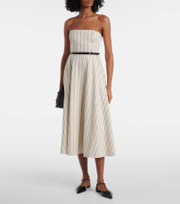 The Fervida midi dress from Max Mara is made from a breezy blend of cotton and linen. The piece features an all-over striped pattern and and has a belt to cinch the waist. Product Details - Material: 66% cotton, 34% linen - Care instructions: dry clean - Made in Italy - Designer color name: Riga Piccola - Closure: zip and hook fastening - Pockets: side slit pockets - Lining: 78% polyamide, 22% elastane - Lining II: 59% viscose, 38% cotton, 3% elastane - Contains non-textile parts of animal origin - Detachable belt - Item number: P01024087 Size & Fit - True to size - Strapless - Internal boned corset for support - Cinched waist - Non-stretchy fabric - DT = German size - The model seen in the picture is 178cm-5'10" and wearing a size DT 34