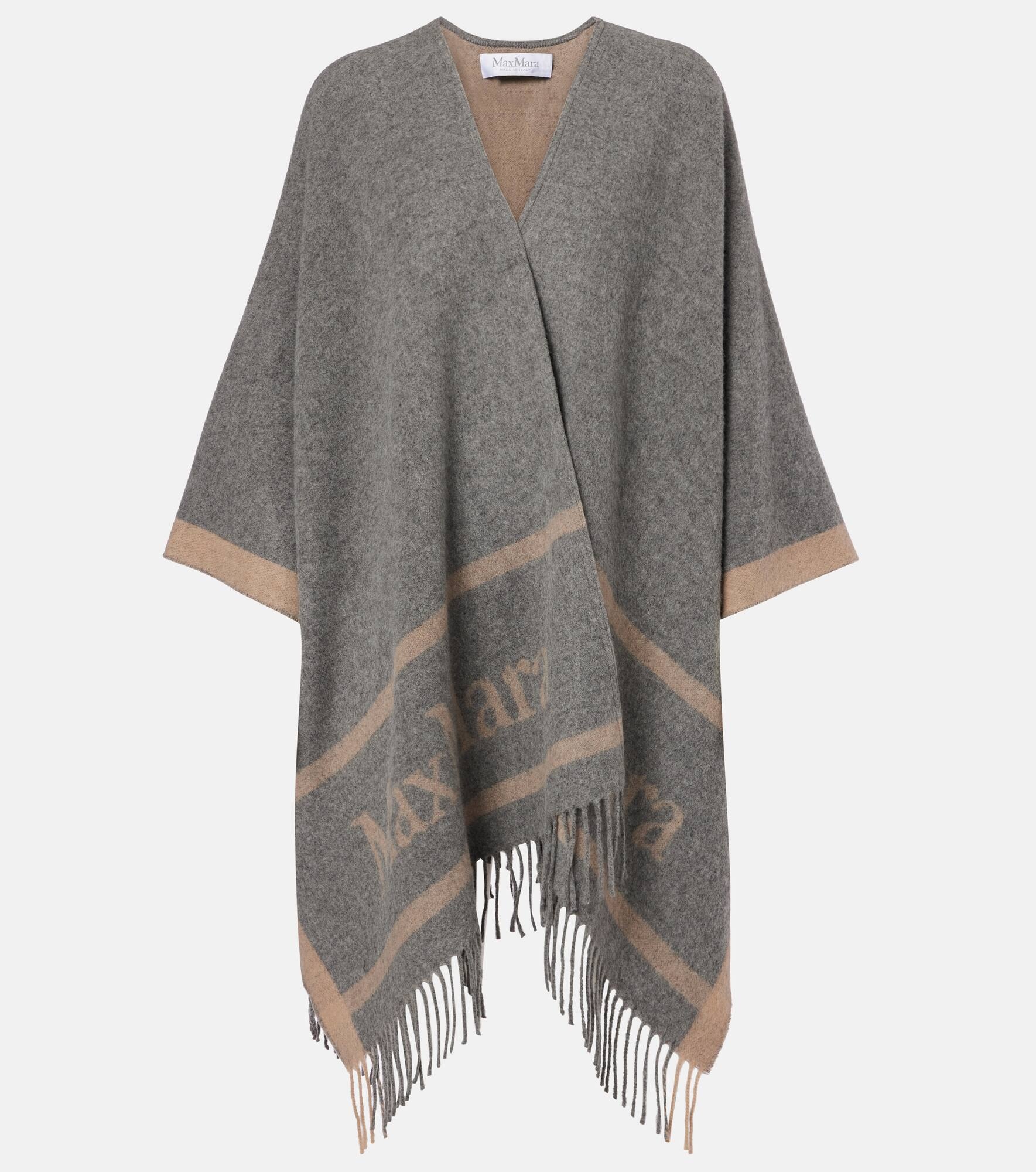 Boasting a rich manufacturing history, Max Mara represents the quintessence of Italian sophistication and expertise. As a result, the Hilde cape is crafted from wool jacquard and detailed with logo lettering throughout and elegant fringes at the hem. Product Details - Material: 100% wool - Care instructions: dry clean - Made in Italy - Designer color name: Grigio - Item color: gray, beige - Includes: garment bag - Fringed hem - Item number: P01076815 Size & Fit - True to size - Designed for an extremely oversized fit - Non-stretchy fabric - One size - Length of fringe 8cm-3"