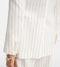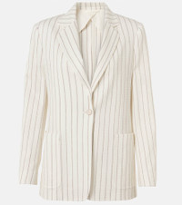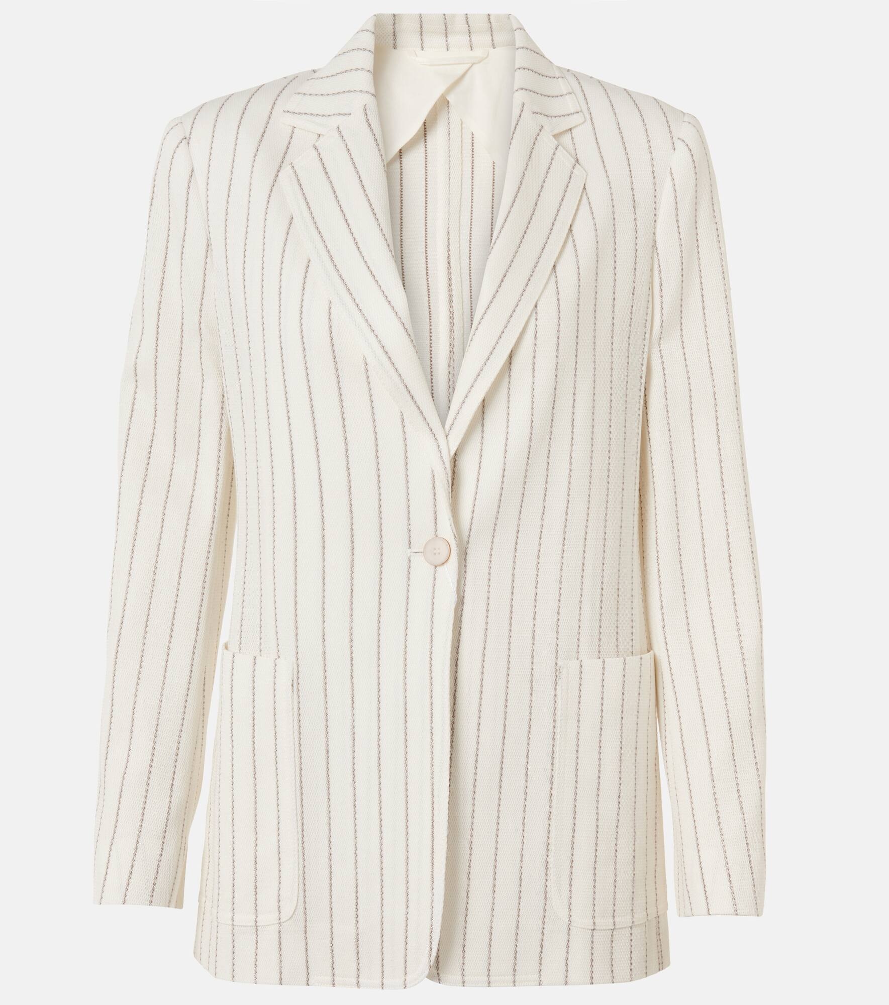 Boasting a rich manufacturing history, Max Mara represents the quintessence of Italian sophistication and expertise. The Jadi blazer from Max Mara is made from cotton and linen to a single-breasted silhouette with chalk stripes. Product Details - Material: 62% cotton, 38% linen - Care instructions: dry clean - Made in Italy - Designer color name: Gesso Riga Caffe - Item color: white - Lining: 59% viscose, 38% cotton, 3% elastane - Closure: single-breasted (one button) - Pockets: patch pockets - Item number: P01024096 Size & Fit - True to size - Shoulder pad inserts - Designed for a loose fit - Non-stretchy fabric - Falls below the hip - The model seen in the picture is 178cm-5'10" and wearing a size DE 34