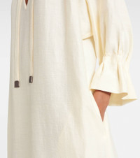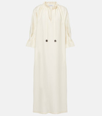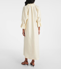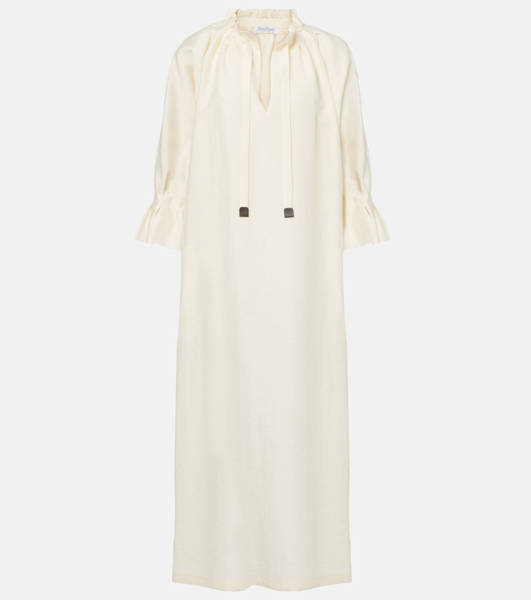 Boasting a rich manufacturing history, Max Mara represents the quintessence of Italian sophistication and expertise. Made in Italy from a breezy blend with linen and silk, the Jene maxi dress features puff sleeves and a self-tie neckline. Product Details - Material: 47% linen, 39% silk, 14% polyamide - Care instructions: dry clean - Made in Italy - Designer color name: Avorio - Item color: white - Pockets: side slit pockets - Item number: P01035700 Size & Fit - True to size - Designed for a loose fit - Non-stretchy fabric - slit length 41,0cm-16" - The model seen in the picture is 178cm-5'10" and wearing a size DE 34