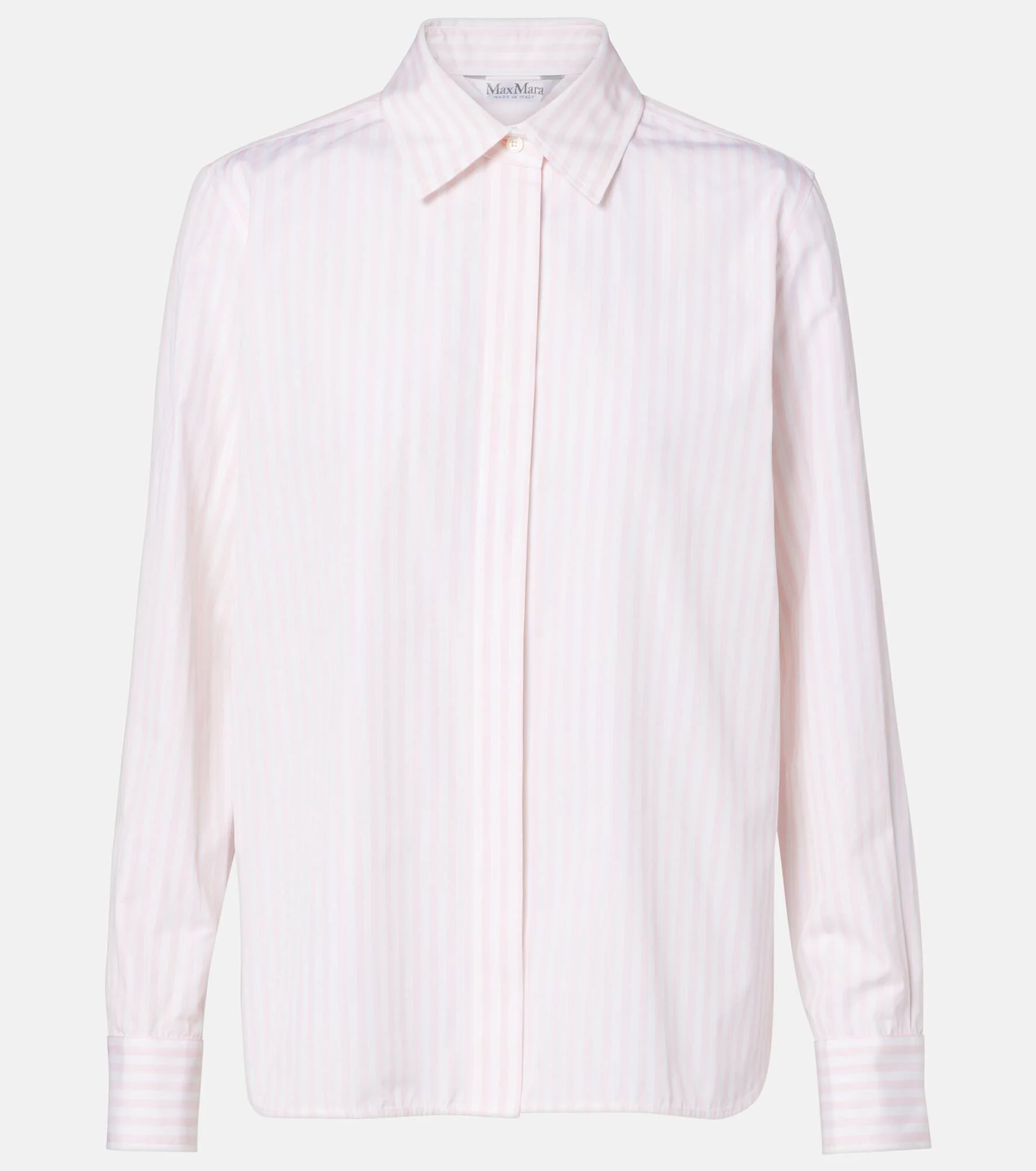 Boasting a rich manufacturing history, Max Mara represents the quintessence of Italian sophistication and expertise. The Maccenni shirt comes in a striped cotton fabric and features a classic straight collar. Product Details - Material: 100% cotton - Care instructions: machine wash at 30 degrees - Made in Italy - Designer color name: Bianco/Rosa - Item color: white, pink - Collar: classic (Straight point) - Closure: buttoned placket - Cuff: buttoned - Contains non-textile parts of animal origin - Item number: P01120700 Size & Fit - True to size - Straight fit - Non-stretchy fabric - Falls to the hip - The model seen in the picture is 178cm-5'10" and wearing a size DE 34