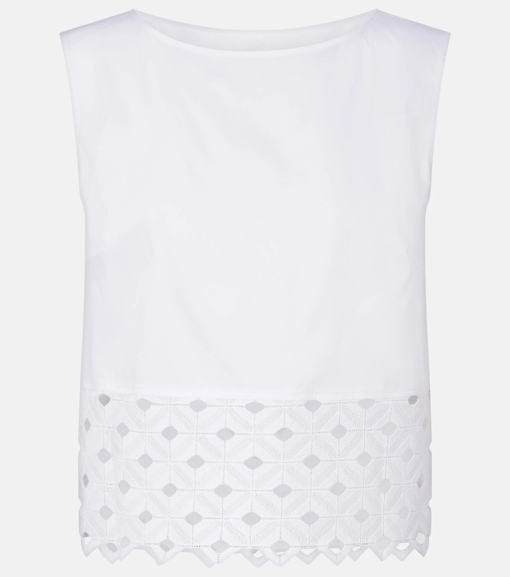 Boasting a rich manufacturing history, Max Mara represents the quintessence of Italian sophistication and expertise. The Maggio top is carefully crafted in Italy from cotton-blend fabric and boasts a sleeveless silhouette. Product Details - Material: 71% cotton, 25% polyamide, 4% elastane - Care instructions: hand wash - Made in China - Color: white - Designer color name: Bianco Ottico - Embroidery: 70% polyester, 30% cotton - Item number: P01152712 Size & Fit - True to size - Low back - Straight fit - Non-stretchy fabric - Slightly cropped - The model seen in the picture is 178cm-5'10" and wearing a size XS
