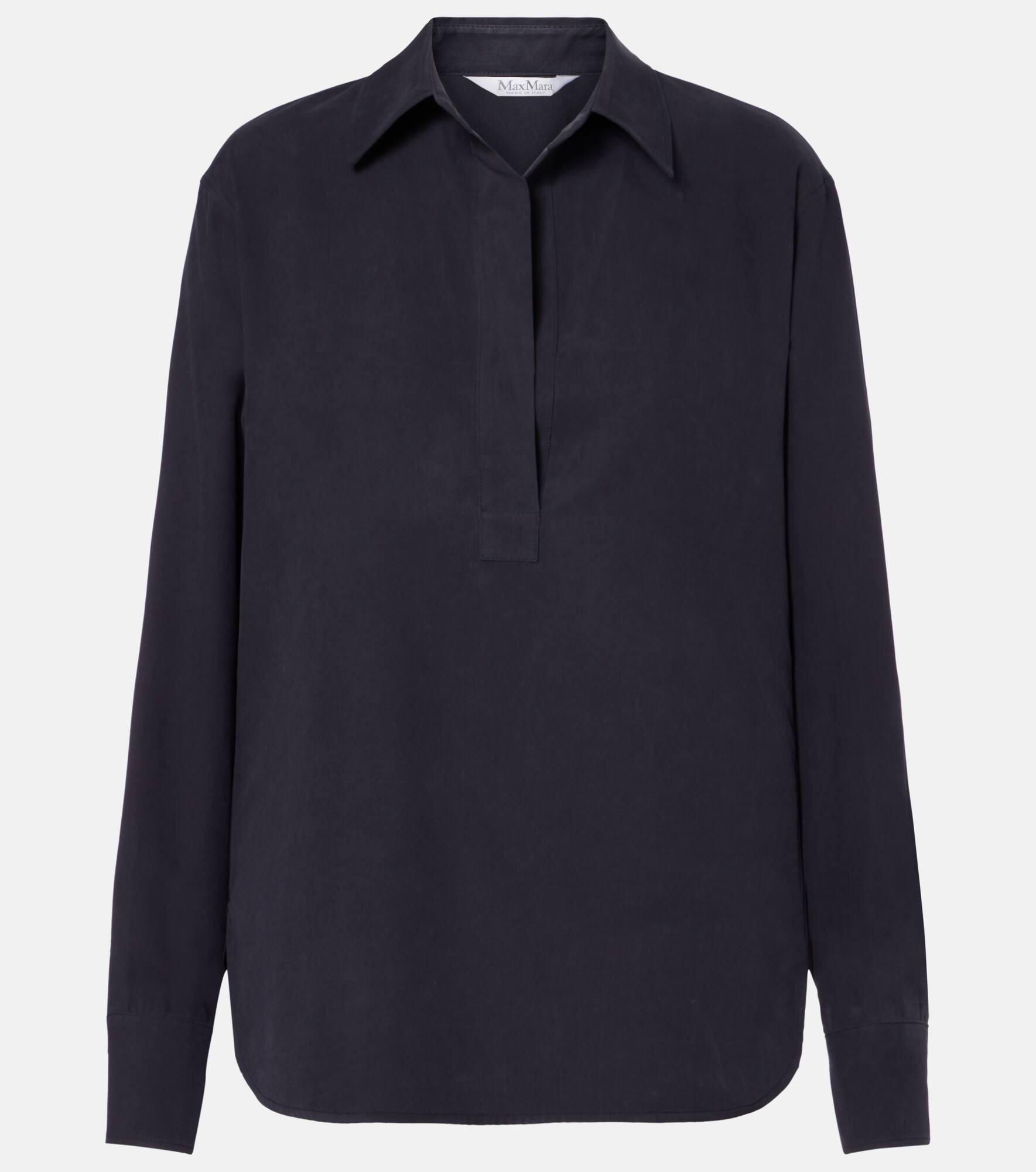 The Mirko blouse from Max Mara is a versatile, sophisticated staple for office, dinner, and beyond. Crafted in Italy from lightweight silk crepe, this design features an elegant buttonless polo collar and long sleeves with buttoned cuffs. Product Details - Material: 100% silk - Care instructions: dry clean - Made in Italy - Designer color name: Lampone - Item color: blue - Collar: polo collar - Cuff: buttoned - Item number: P01090657 Size & Fit - True to size - Straight fit - Non-stretchy fabric - Falls below the hip - The model seen in the picture is 178cm-5'10" and wearing a size DE 34