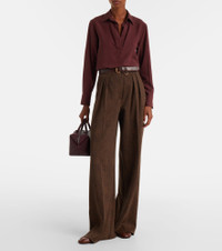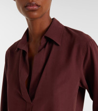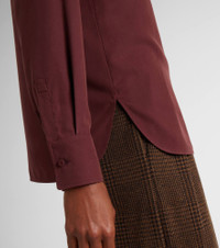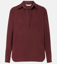 The Mirko blouse from Max Mara is a versatile, sophisticated staple for office, dinner, and beyond. Crafted in Italy from lightweight silk crepe, this design features an elegant buttonless polo collar and long sleeves with buttoned cuffs. Product Details - Material: 100% silk - Care instructions: dry clean - Made in Italy - Designer color name: Ciliegia - Item color: burgundy - Collar: polo collar - Cuff: buttoned - Item number: P01090658 Size & Fit - True to size - Straight fit - Non-stretchy fabric - Falls below the hip - The model seen in the picture is 178cm-5'10" and wearing a size DE 34